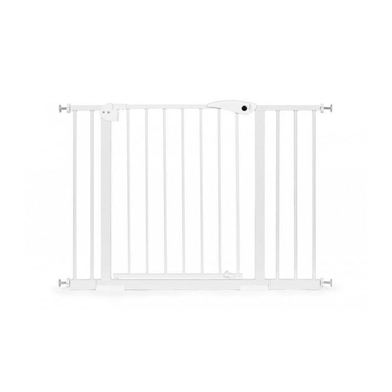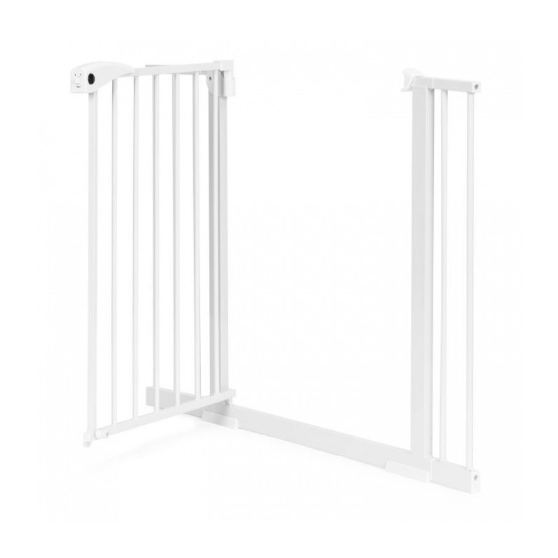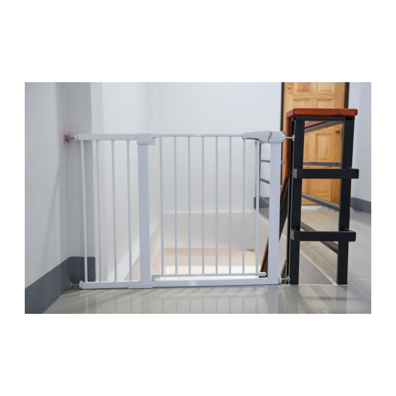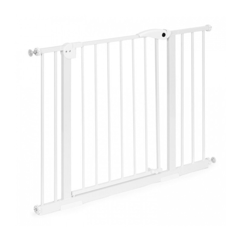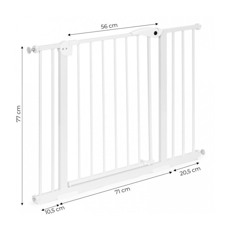 Poarta de siguranta este perfecta pentru securizarea scarilor si a usilor, blocand eficient accesul copiilor si animalelor de companie. Latimea este reglabila de la 74 cm si poate fi extinsa pana la 105 cm cu panouri suplimentare si suruburi de presiune. Un cadru solid din otel vopsit in camp electrostatic, cu o poarta de deschidere, asigura durabilitate si un aspect elegant.