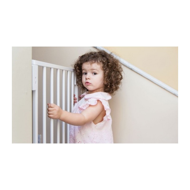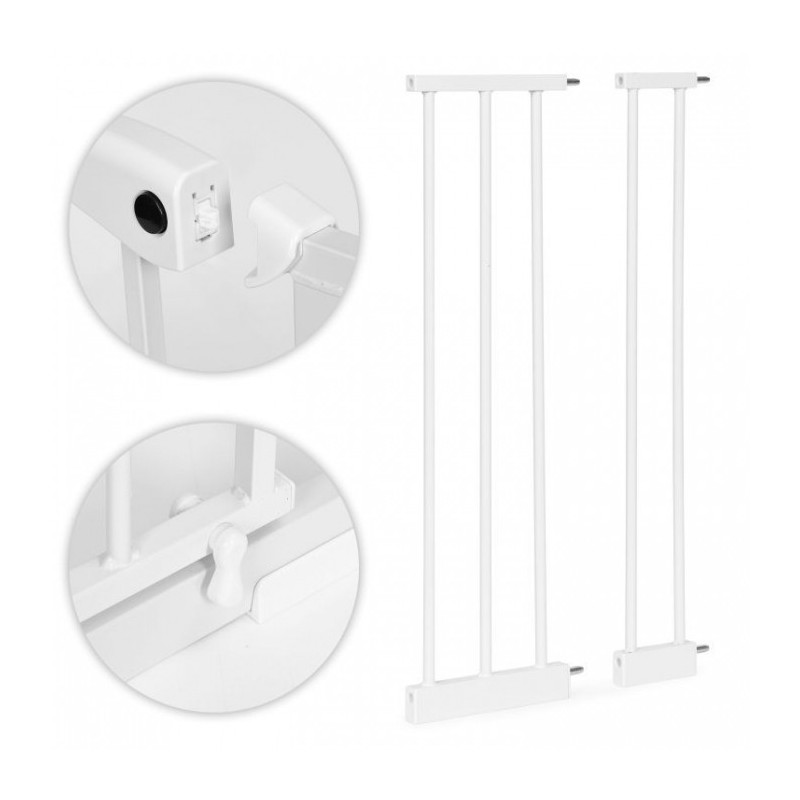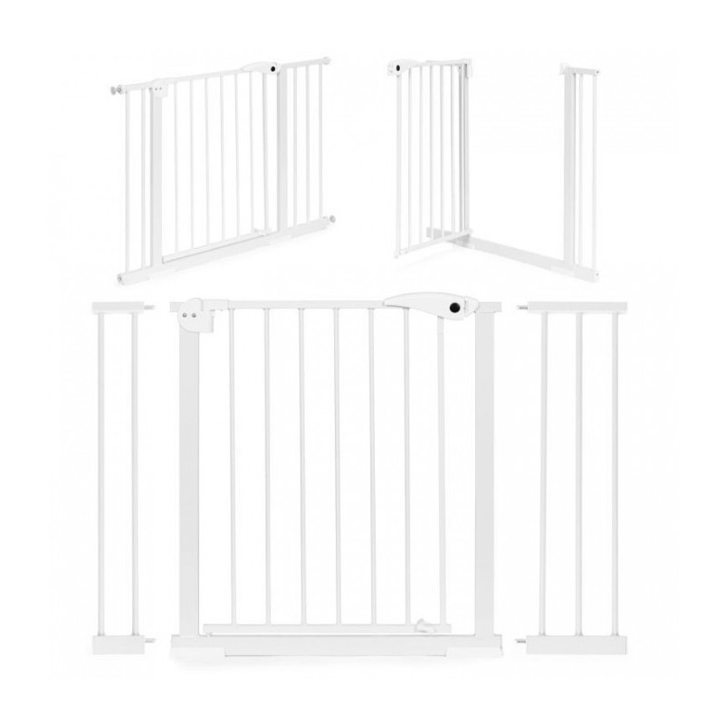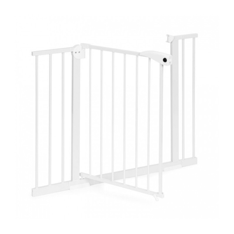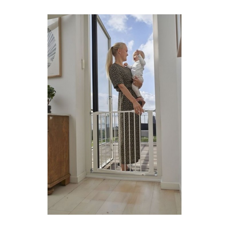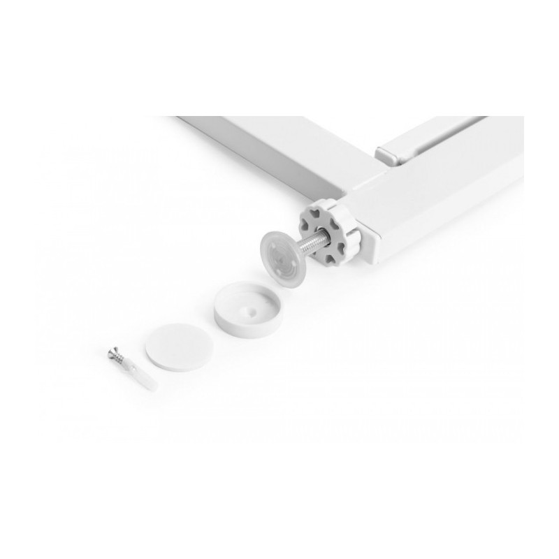 Poarta de siguranta este perfecta pentru securizarea scarilor si a usilor, blocand eficient accesul copiilor si animalelor de companie. Latimea este reglabila de la 74 cm si poate fi extinsa pana la 105 cm cu panouri suplimentare si suruburi de presiune. Un cadru solid din otel vopsit in camp electrostatic, cu o poarta de deschidere, asigura durabilitate si un aspect elegant.