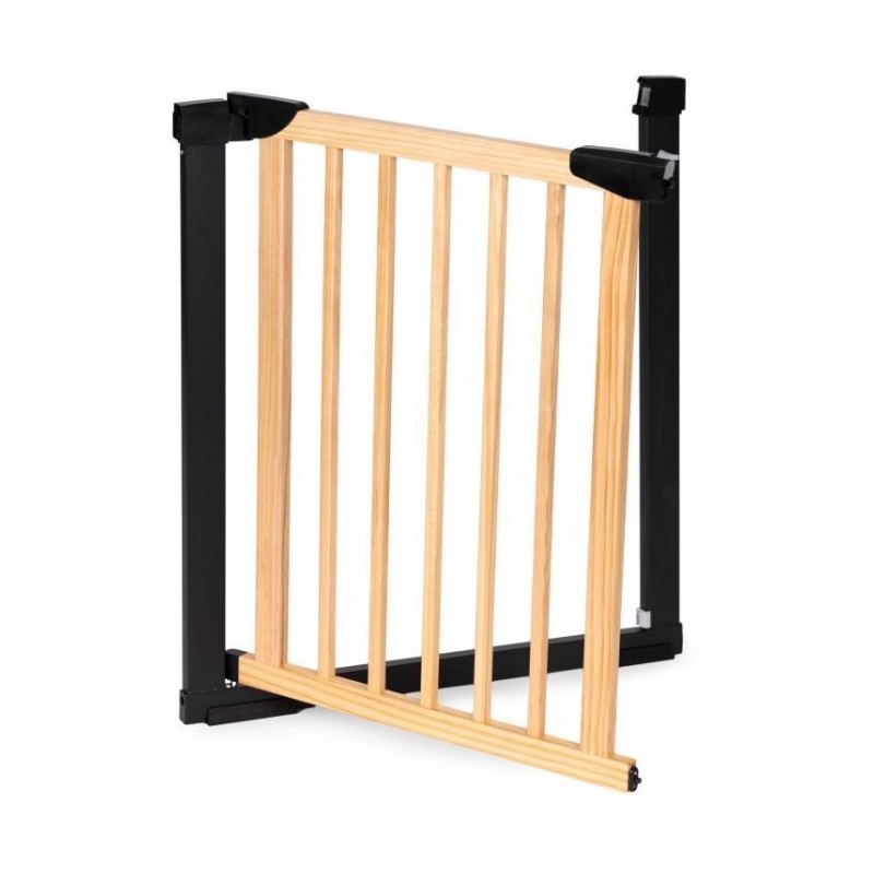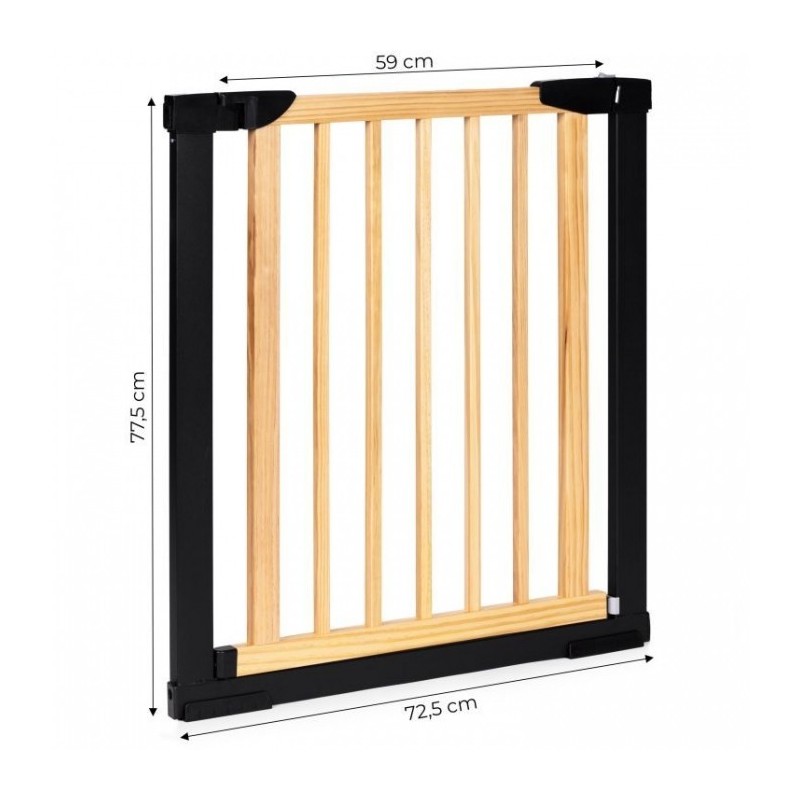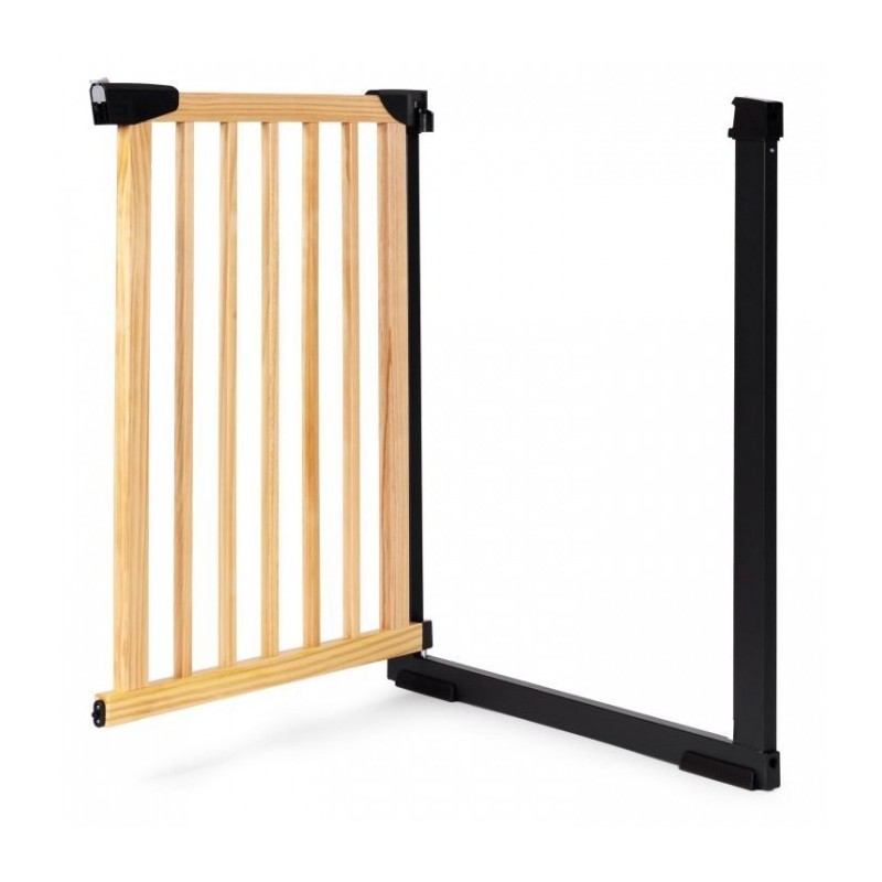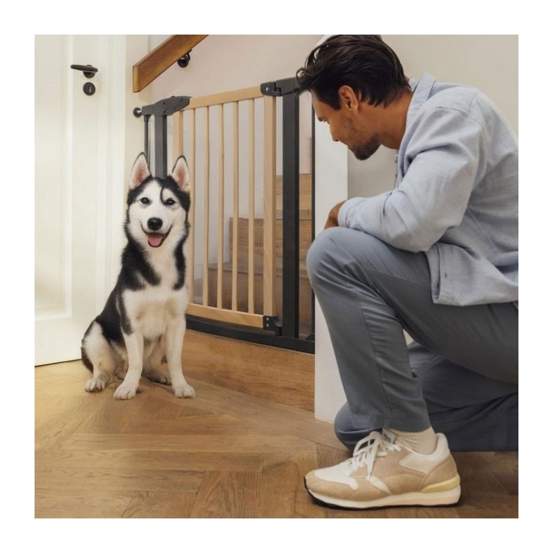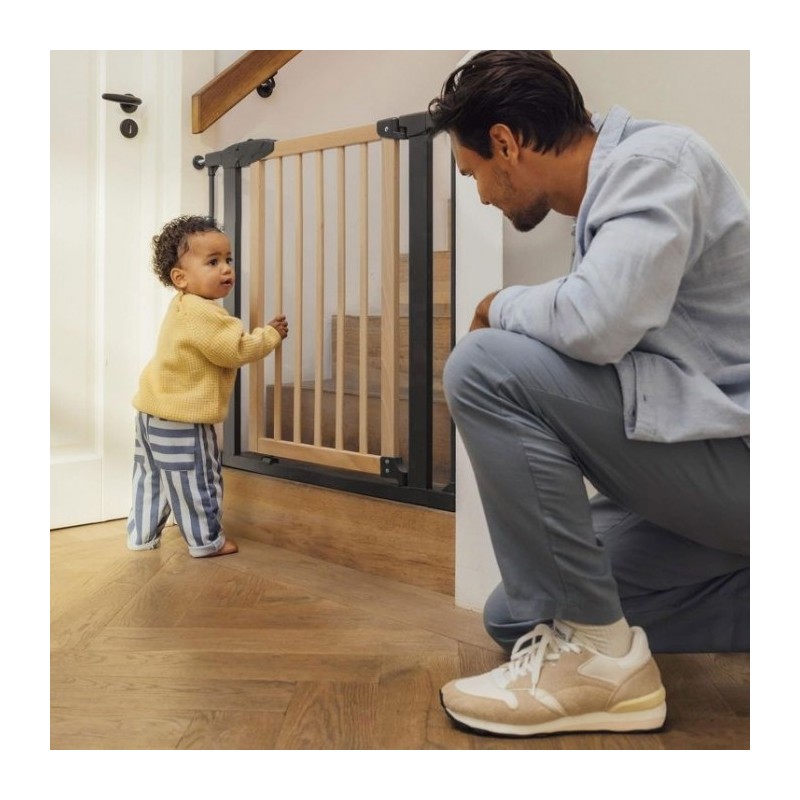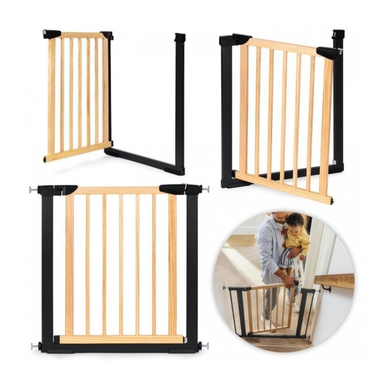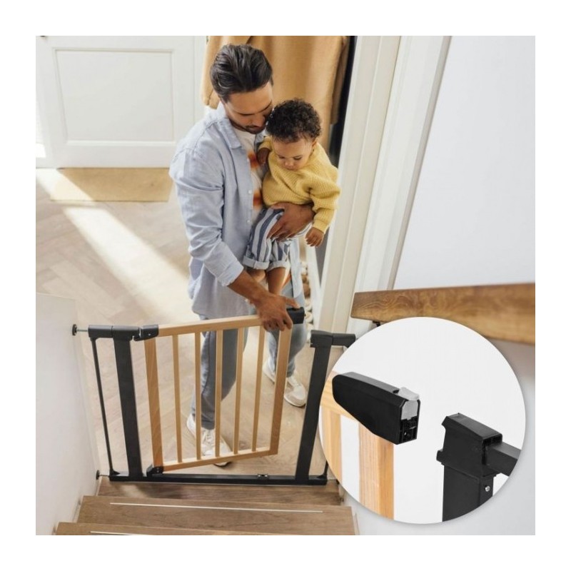 Poarta de siguranta este perfecta pentru securizarea scarilor si a usilor, blocand eficient accesul copiilor si animalelor de companie. Latimea este reglabila de la 74 cm si poate fi extinsa pana la 80 cm. Rama metalica durabila cu o poarta din lemn, cu deschidere batanta, asigura durabilitate si un aspect estetic placut.