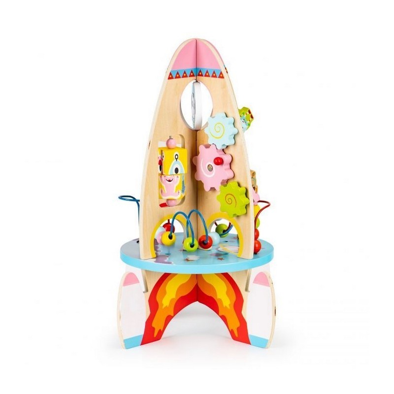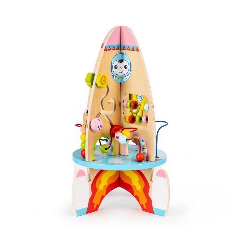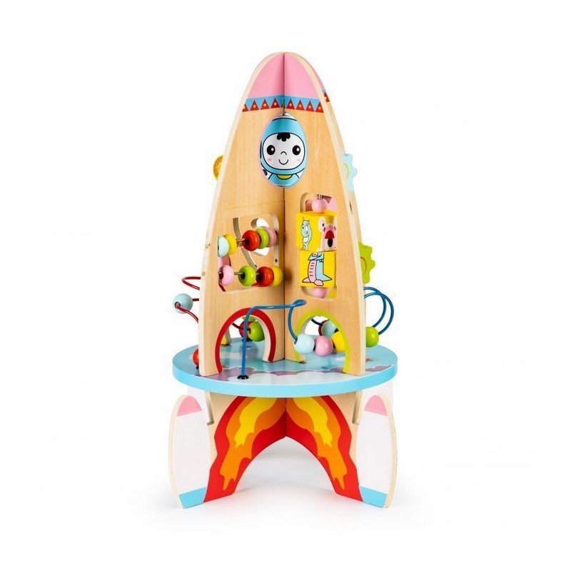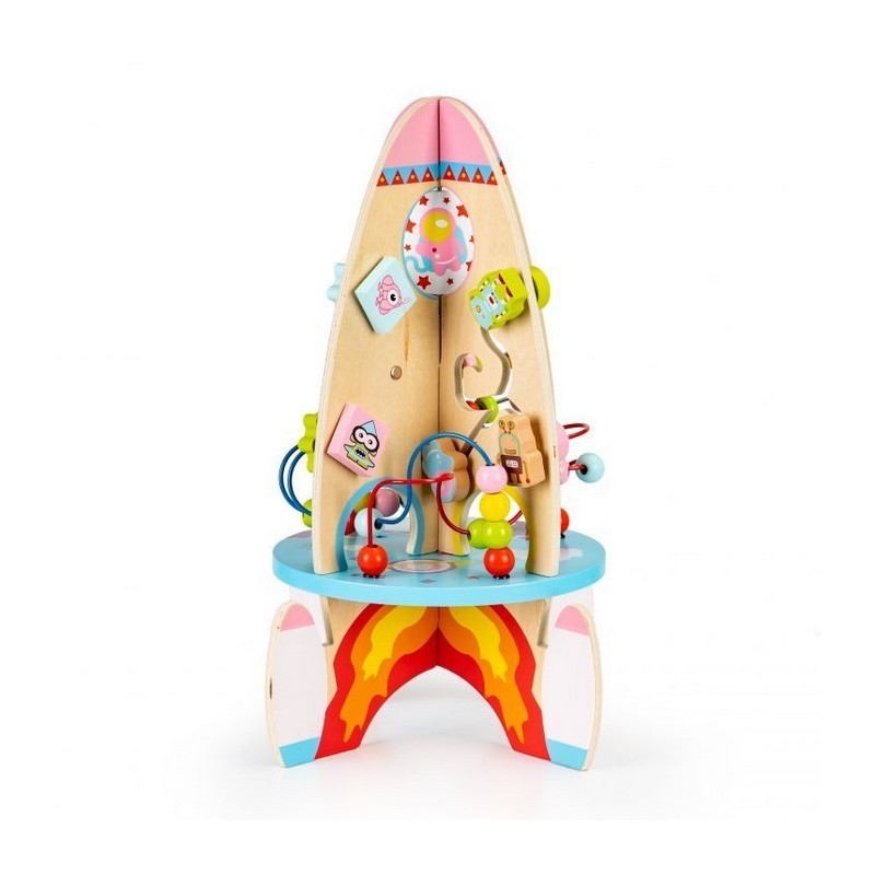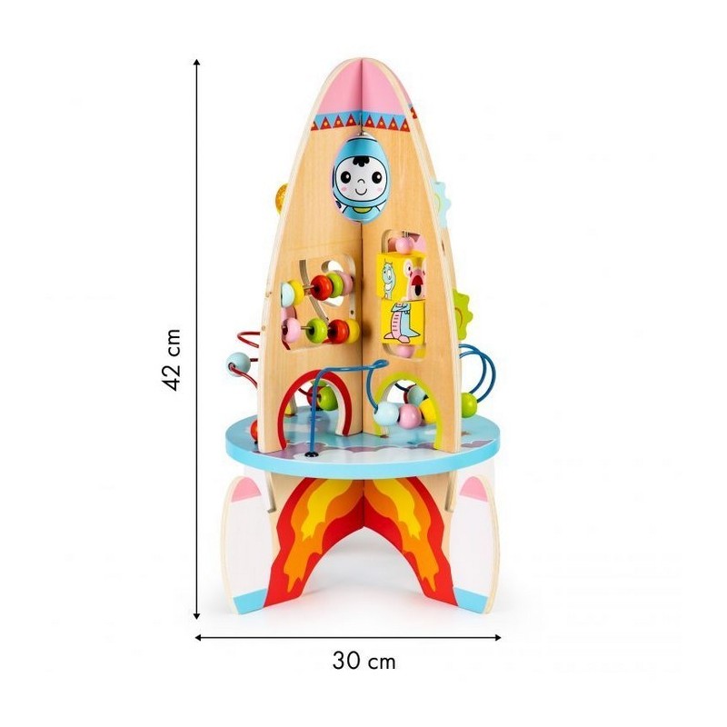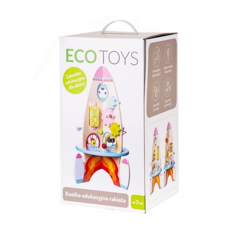 Racheta educationala Ecotoys este realizata in intregime din lemn si acoperita cu vopsele sigure pentru copii. Jucaria are 8 pereti cu elemente colorate, in miscare, care vor stimula dezvoltarea copilului. Jucaria include labirinte cu margele, roti dintate rotative si alte elemente in miscare care vor atrage ore lungi de distractie.