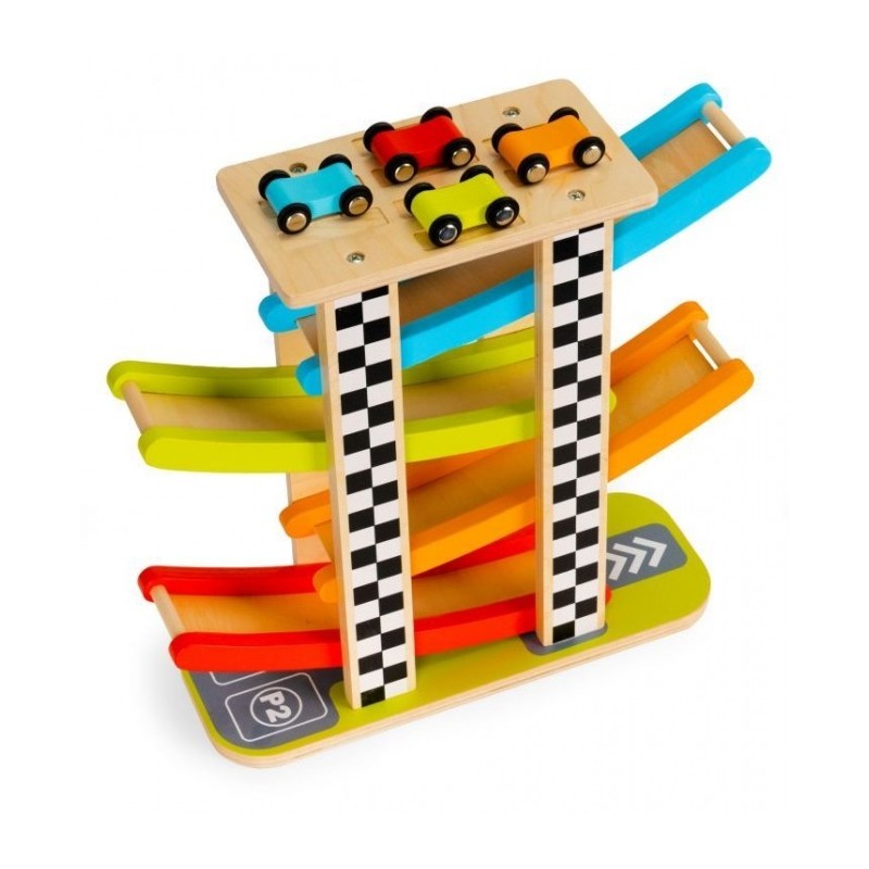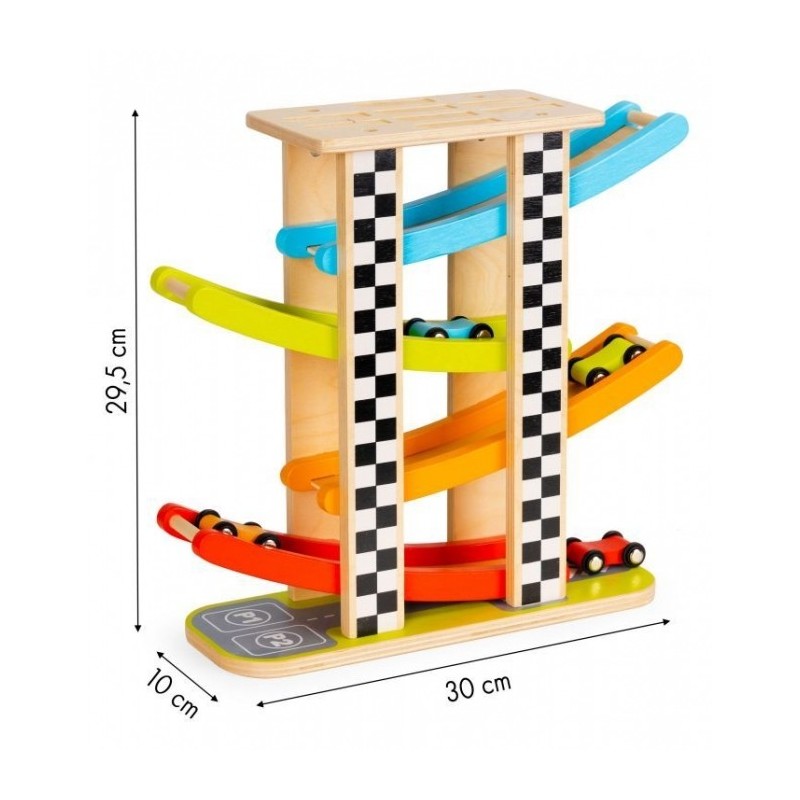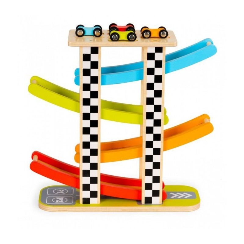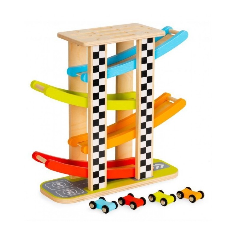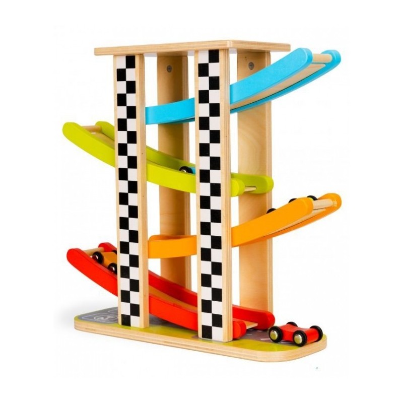 Jucaria este fabricata din lemn de inalta calitate, datorita caruia rampa pentru masini va servi multi ani. Pista are 4 diapozitive de diferite culori pe care masinile incluse in set pot aluneca. O astfel de distractie ii atrage pe copii ore in sir.