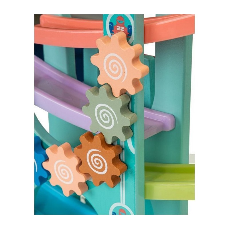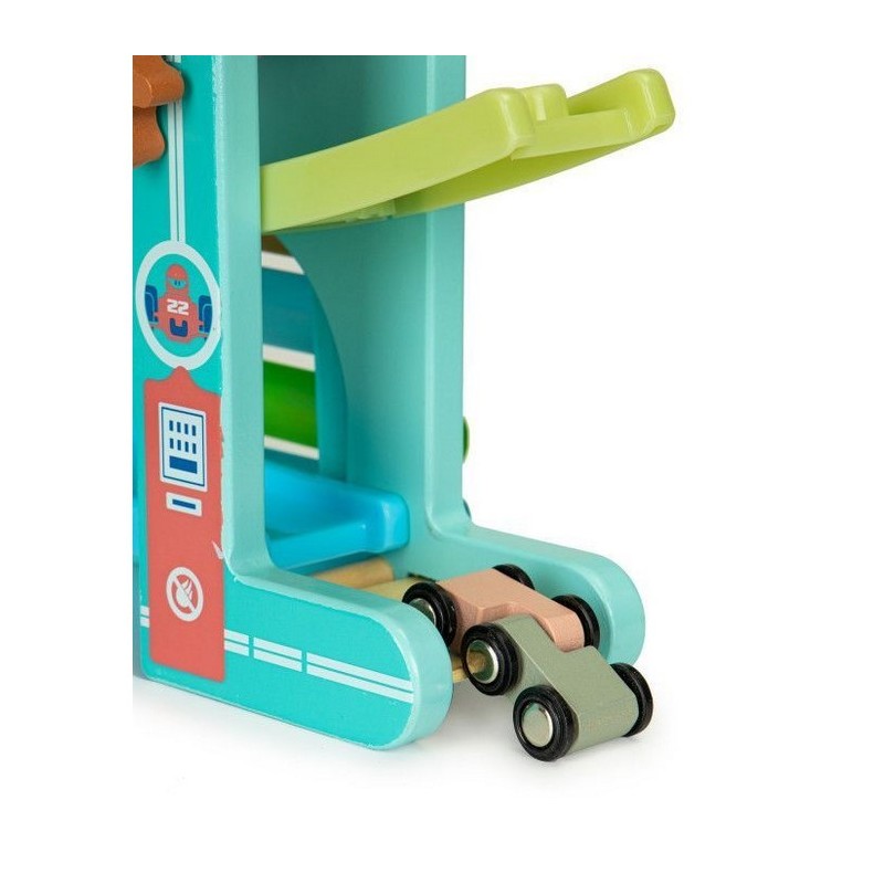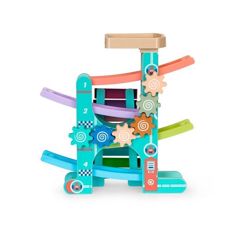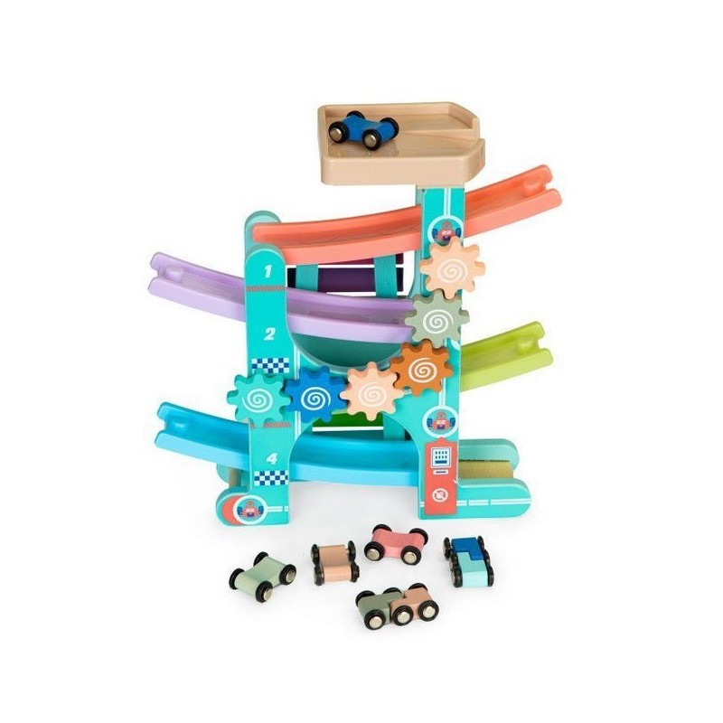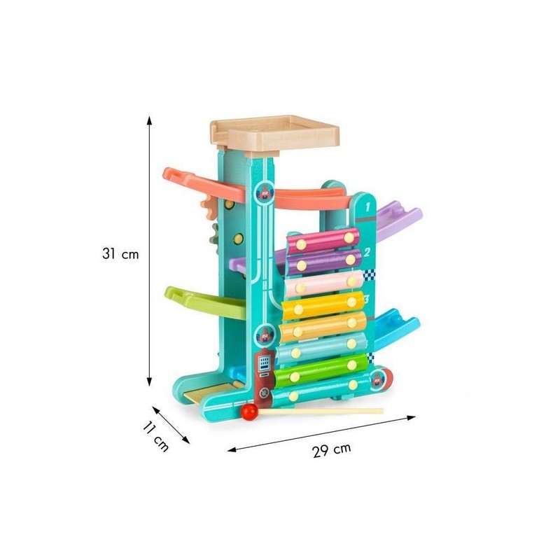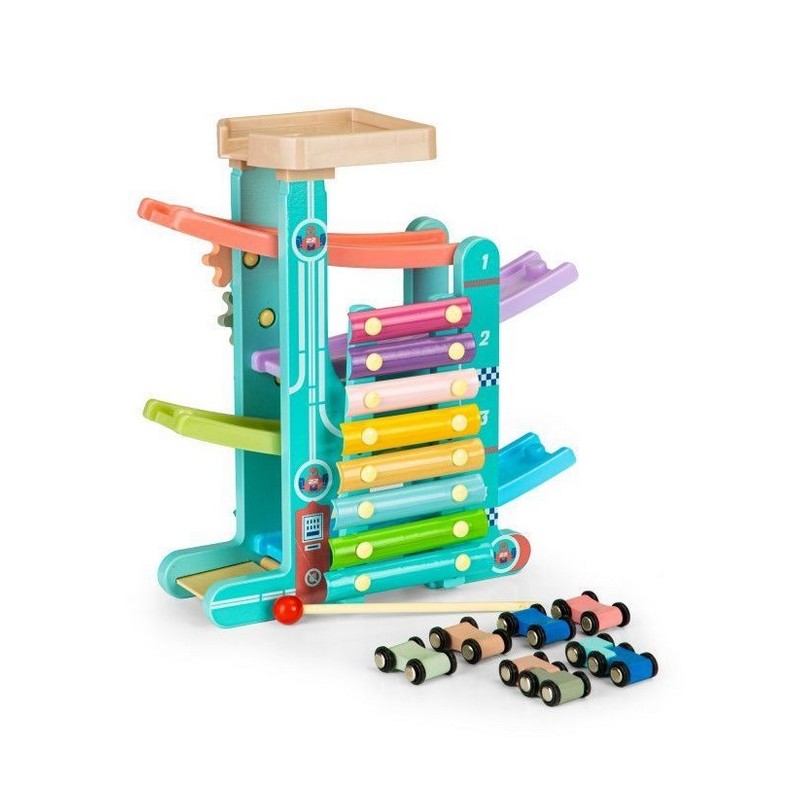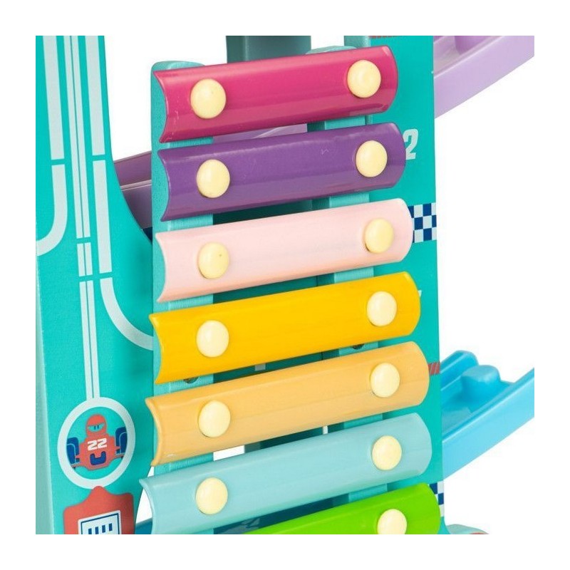 Principala atractie a jucariei este un tobogan pe care copilul poate elibera masinutele, incluse in set, de pe platforma de pornire. Fiecare dintre cele 6 masinute are o culoare diferita, datorita careia copilul isi va putea organiza propriile curse. Pe langa pista pentru masini, jucaria a fost imbogatita cu un perete cu xilofon si un bat pentru joaca. Fiecare dintre cele 8 lamele metalice are un ton diferit, datorita caruia copilul dvs. va putea compune propriile melodii.