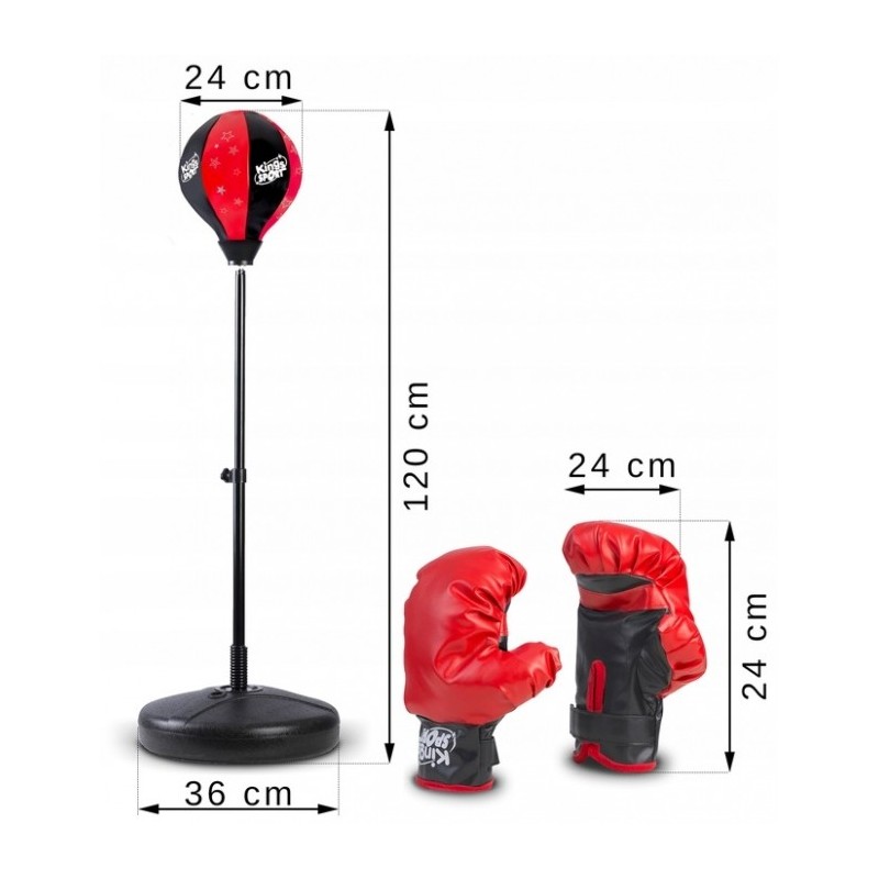 Setul contine: un sac de box cu arc si manusi. Sacul este montat pe un brat de otel. Manusile incluse sunt universale, potrivite pentru mana unui copil. Ele au un strat de absorbtie a socurilor. Setul include si un set de suruburi, saibe si elemente necesare asamblarii lui. Baza este stabila si poate fi incarcata cu apa sau nisip.