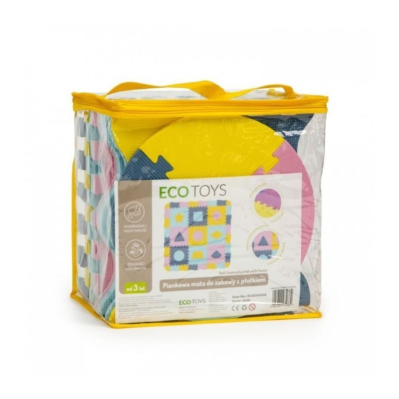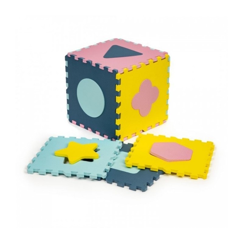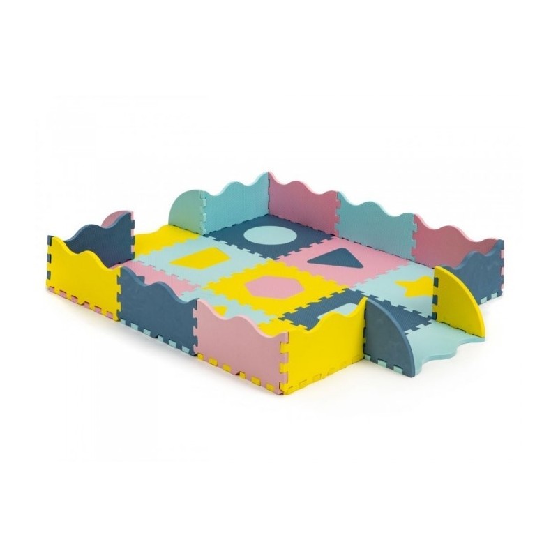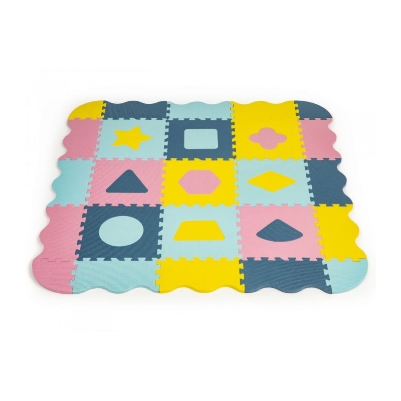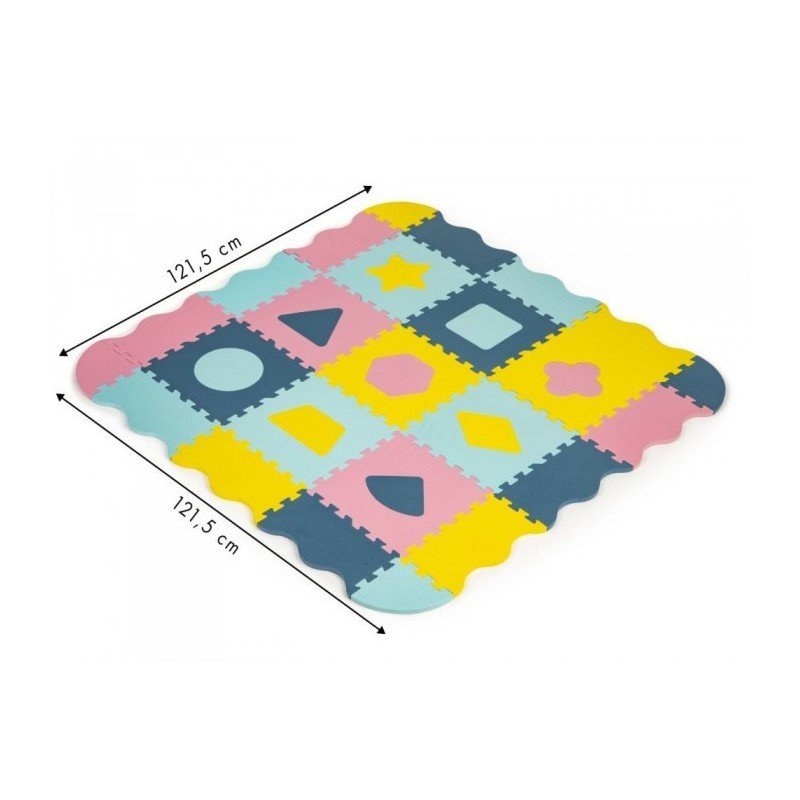 O salteluta din spuma moale EVA este perfecta pentru copiii mici care invata sa mearga. O salteluta din spuma de 1.3 cm grosime realizata din puzzle-uri cu figuri geometrice va oferi izolare de la sol si va actiona, de asemenea, ca o piscina uscata care poate fi umpluta cu bile din plastic sau alte jucarii. Setul este format din 25 piese de puzzle-uri patrate mari si colorate care se conecteaza intre ele si pot forma chiar si un perete.