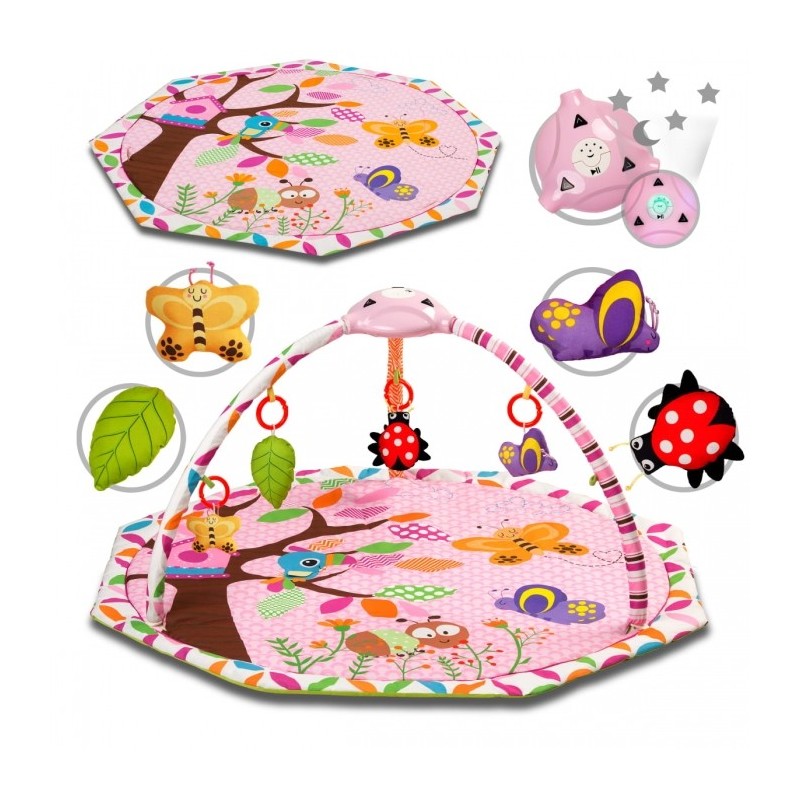 4 jucarii diverse - care pot fi atarnate pe arcade sau atasate la un patut sau carucior, de exemplu. Fiecare jucarie are o forma diferita: frunza verde, fosnitoare tip buburuza si doua fosnitoare tip fluturas - mov si portocaliu.