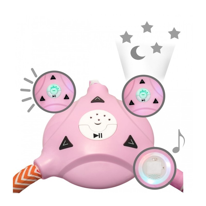Cutiuta de muzica detasabila cu un proiector - eliberati doar incuietorile pentru a o putea pune oriunde, de exemplu langa patut. Contine 8 melodii linistite, iar proiectorul proiecteaza stelele si luna pe tavan.