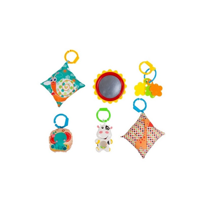 Jucariile sunt agatate pe bara de jucarii a carei inaltime permite atingerea acestora de catre copil.