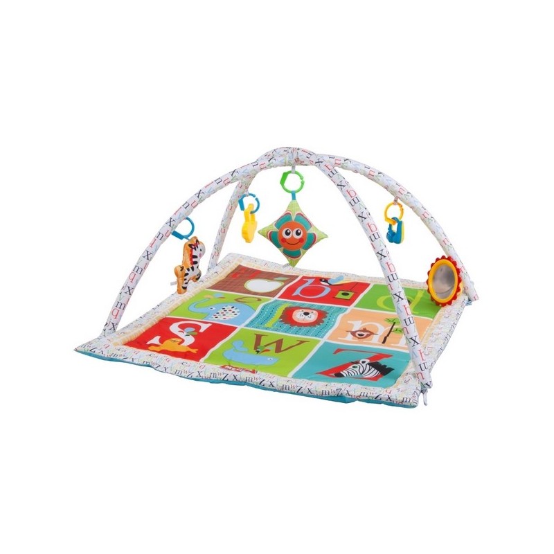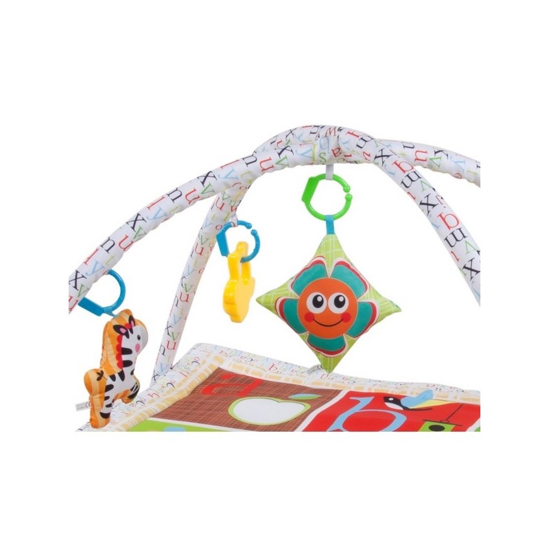 Centrul de joaca este dotat cu figurine litere si reprezentari grafice ale acestora, oglinda cu rama colorata, cutiuta muzicala, figurina zebra.
