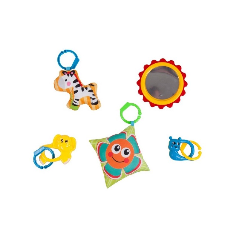 Jucariile sunt agatate pe bara de jucarii a carei inaltime permite atingerea acestora de catre copil.