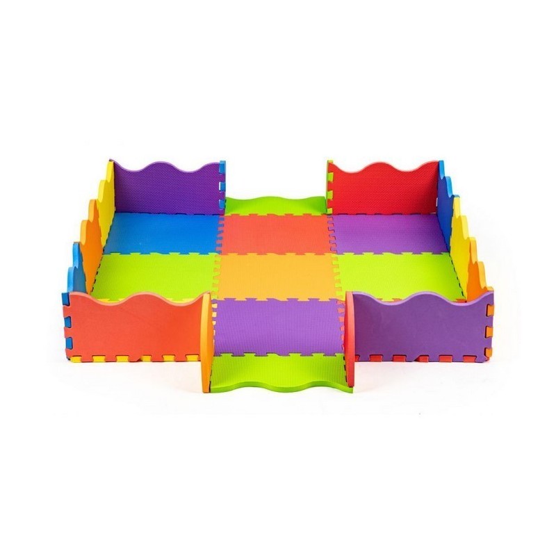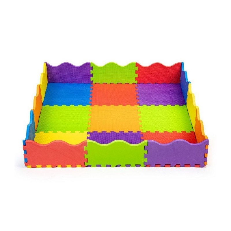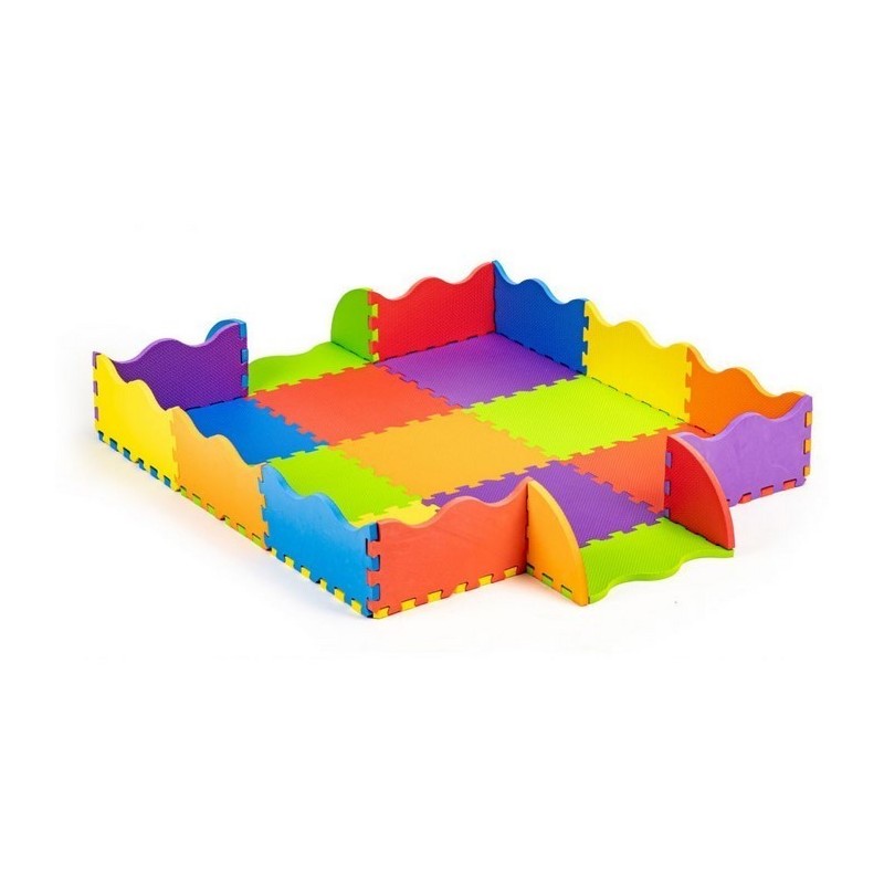 O salteluta din spuma moale EVA este perfecta pentru copiii mici care invata sa mearga. O salteluta din spuma de 1 cm grosime realizat din puzzle-uri va oferi izolare de la sol si va actiona, de asemenea, ca o piscina uscata care poate fi umpluta cu bile din plastic sau alte jucarii. Setul este format din 9 piese de puzzle-uri patrate mari si colorate care se conecteaza intre ele si 16 elemente mai mici, care formeaza un perete mic in jurul saltelei.