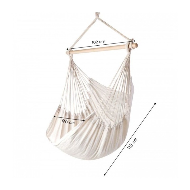 Dimensiunea husei este: 96 x 130 cm si este suspendata de un stalp din lemn de fag de 102 cm. Constructia sa poate rezista pana la 150 kg. Stalpul este suspendat de o ramura de copac, un cadru sau chiar de tavan intr-un singur punct. Setul include si doua perne moi.
