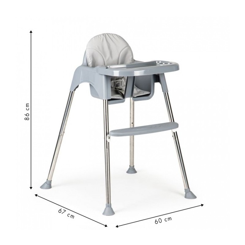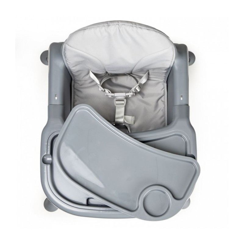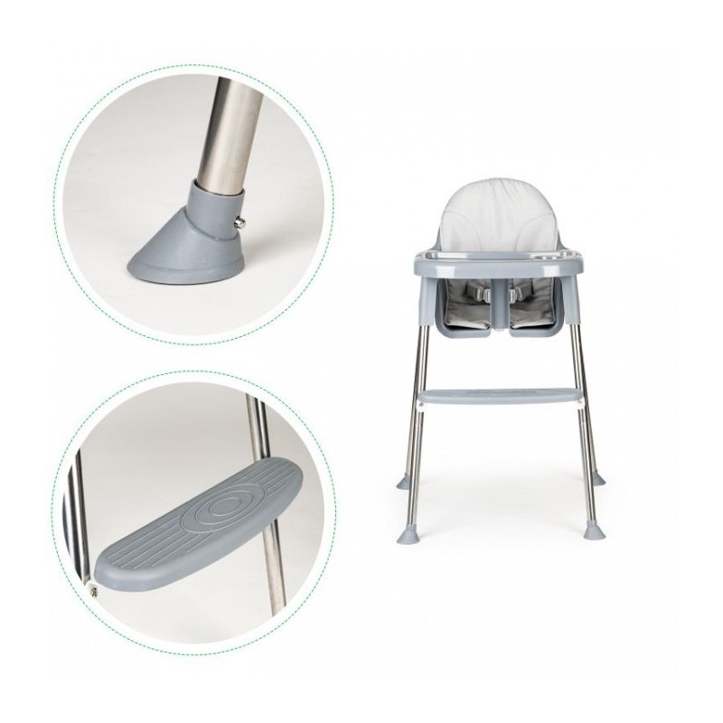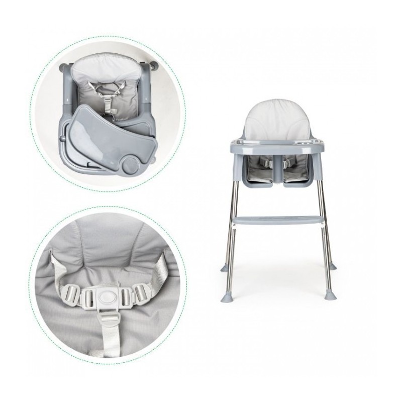 Scaunul de masa are picioare antiderapante din cauciuc, care protejeaza suplimentar podeaua impotriva zgarieturilor. Blocarea pentru copii impotriva alunecarii si centurile de siguranta in 5 puncte ofera cea mai inalta protectie pentru un copilas. Scaunul are un suport pentru picioare si o tava detasabila conturata. Husa scaunului de masa poate fi indepartata cu usurinta pentru a putea fi curatata.