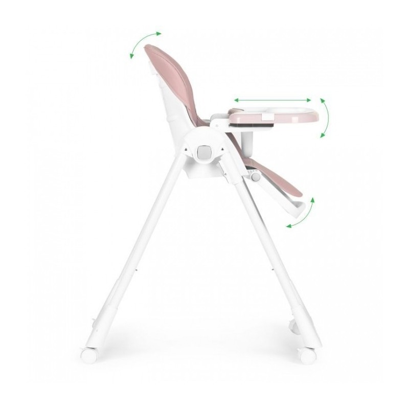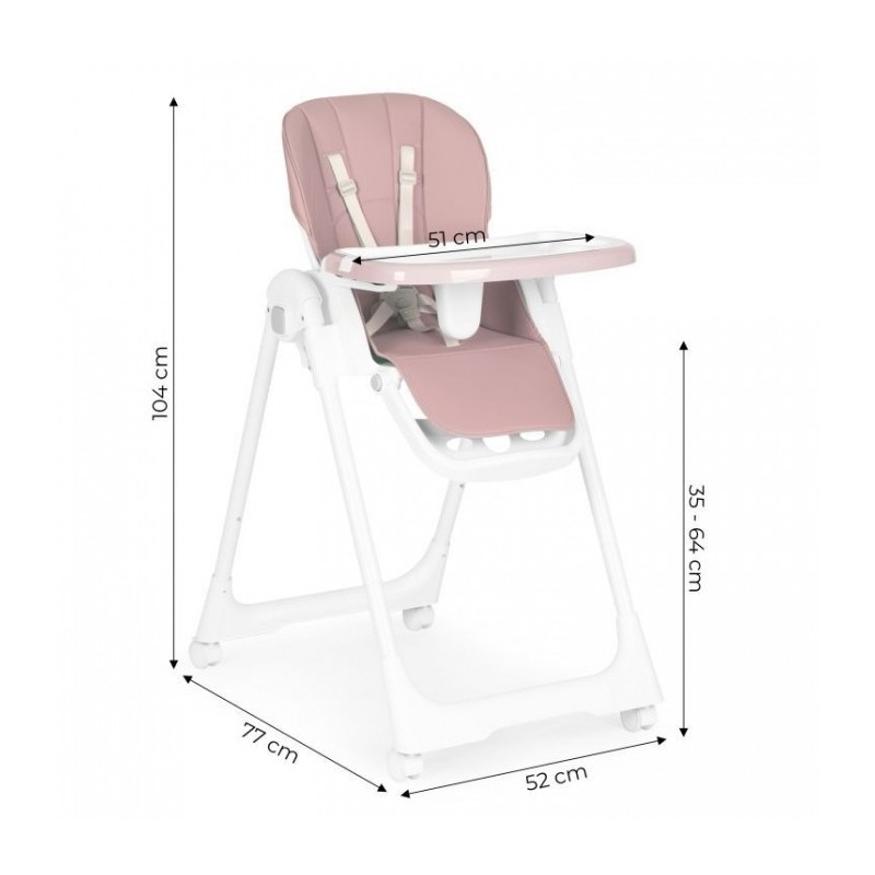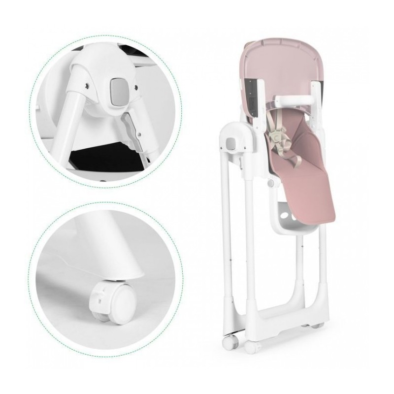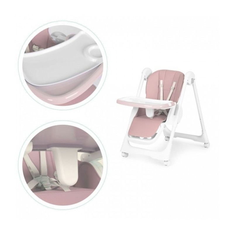 Cadrul scaunului este realizat din metal, ceea ce garanteaza stabilitatea scaunului. Tapiteria moale a scaunului este din piele ecologica si poate fi indepartata cu usurinta pentru curatare. Siguranta copilului este asigurata de centurile de siguranta in 5 puncte si de blocare impotriva alunecarii. Tava are margini ridicate pentru a impiedica varsarea de orice pe podea.