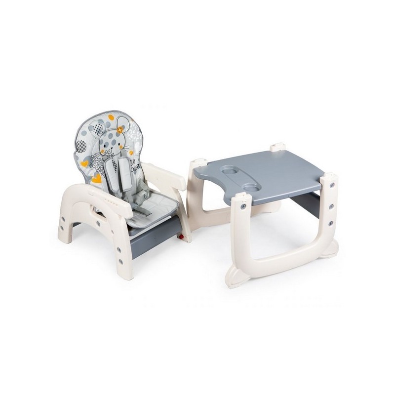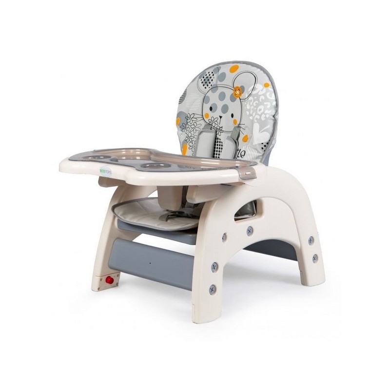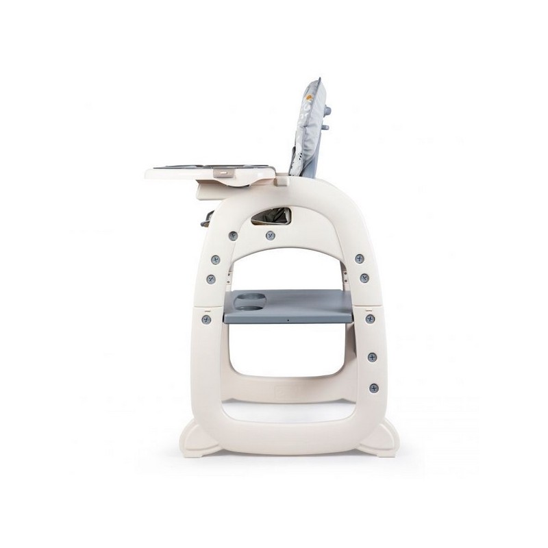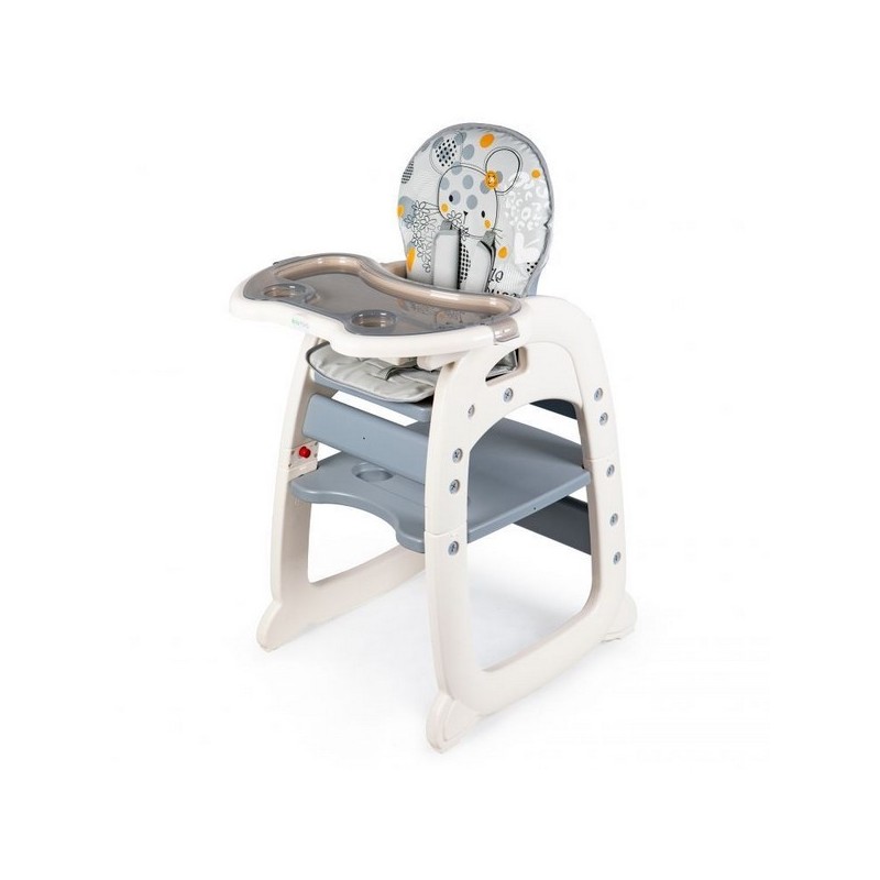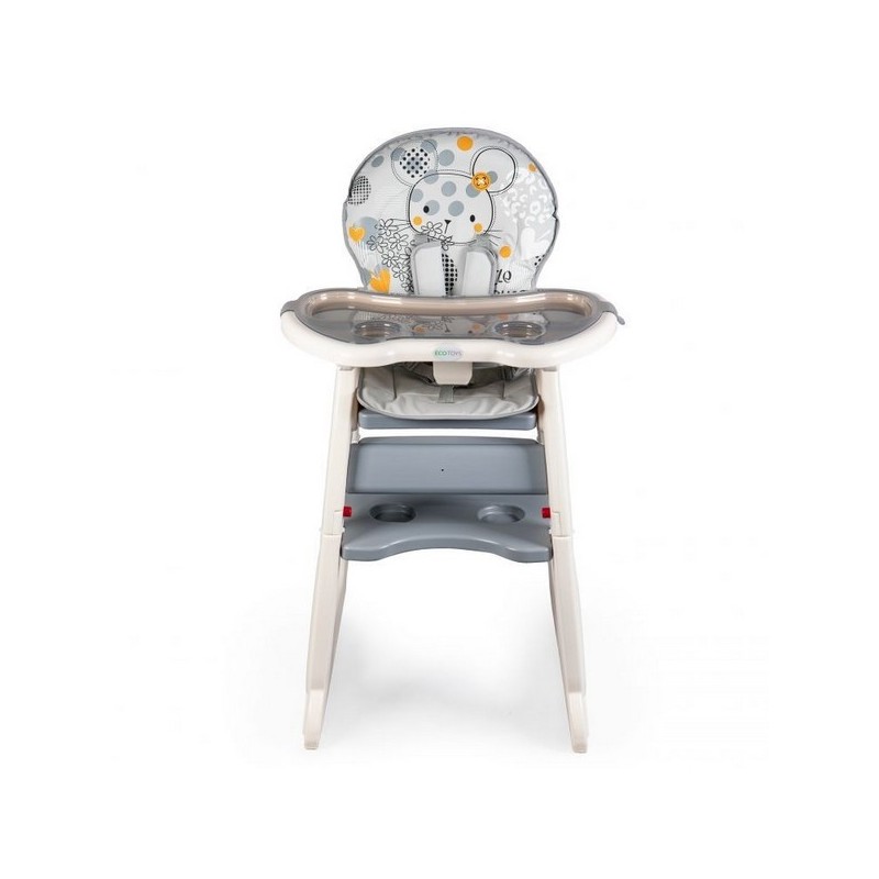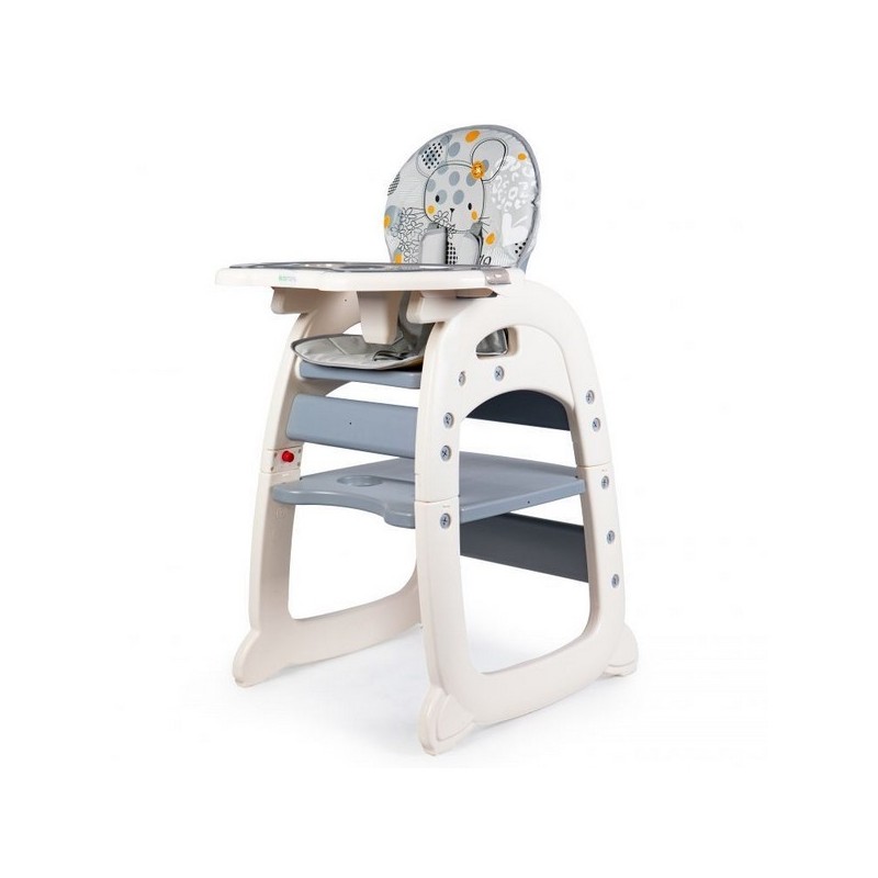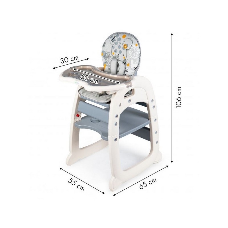 Marginile ridicate ale tavii asigura ca nimic nu se va varsa pe podea. In plus, tava este formata din doua parti, prima parte destinata consumului de alimente iar a doua, pentru jucarii(desenat, colorat, etc.).Husa scaunului poate fi indepartata si spalata cu usurinta, daca este necesar, la 30 de grade. Produsul are picioare speciale antiderapante.