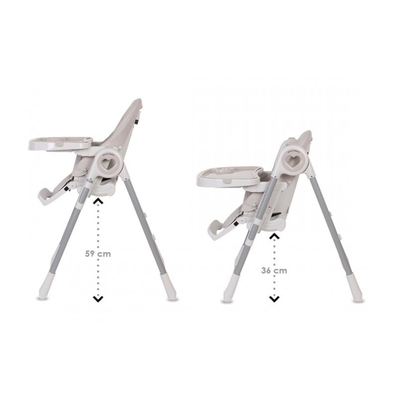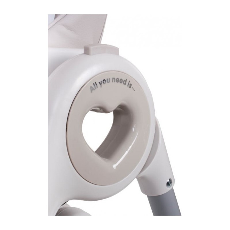 Un scaun inalt cu functe de balansoar. Scaunul are o functie de pliere profunda, datorita careia copilul poate face un pui de somn dupa pranz.