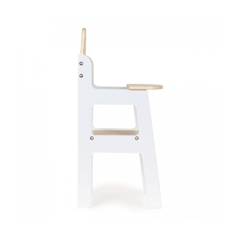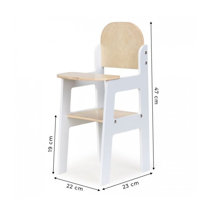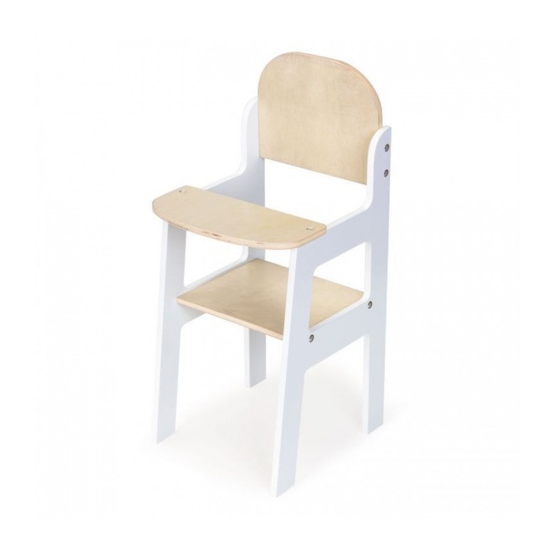 Scaunul inalt ii va permite copilului sa aiba grija de iubita lui papusa sau de ursuletul de plus. Piesa de mobilier functionala pentru joaca acasa, intr-un salon de infrumusetare sau scoala. Este potrivit pentru papusi cu o inaltime de 45 de cm. Totul este din lemn, marginile rotunjite garanteaza siguranta in timpul jocului.