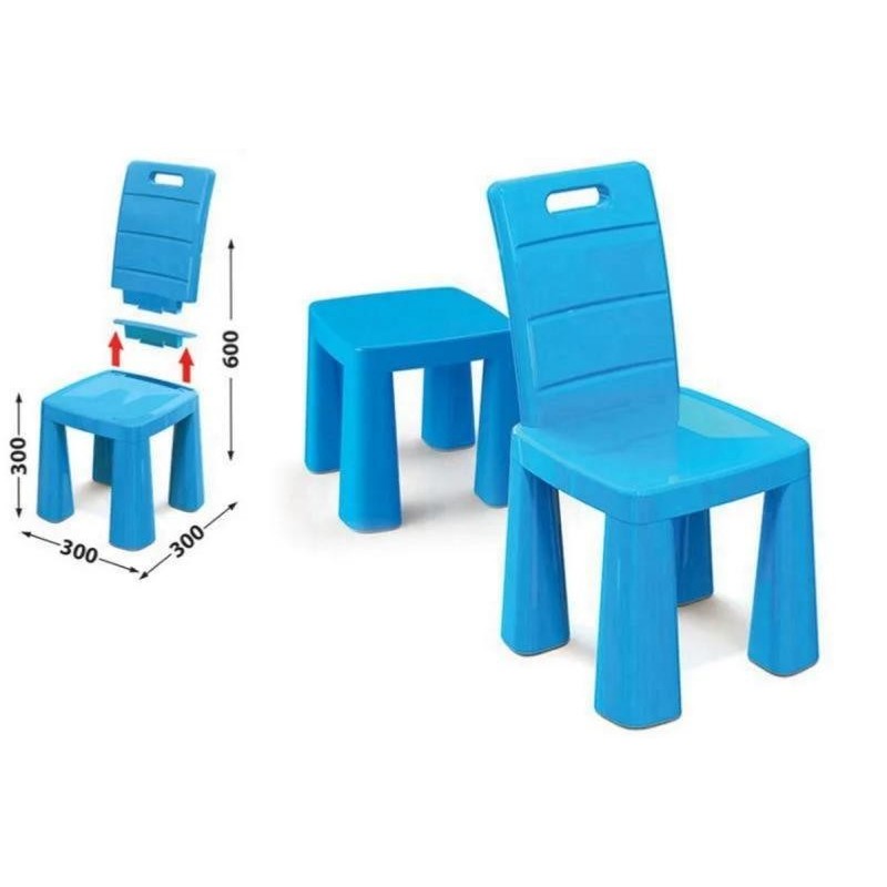 Scaunul pentru copii este dotat cu spatar detasabil, datorita caruia scaunul se transforma intr-un taburet sau mini masa.