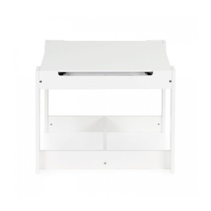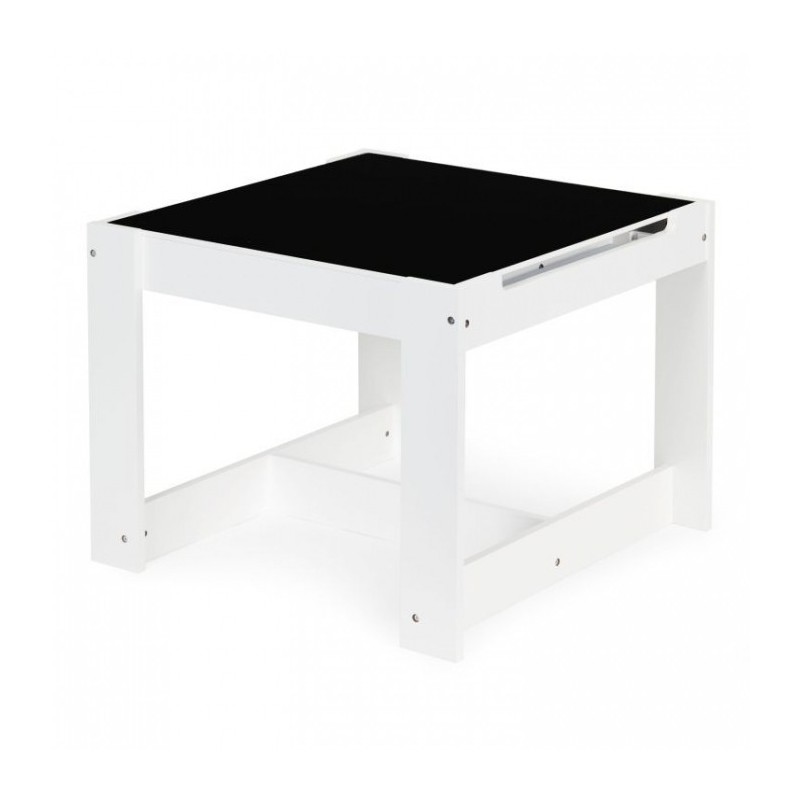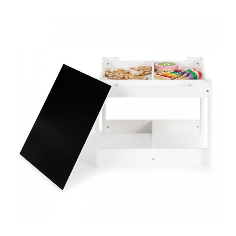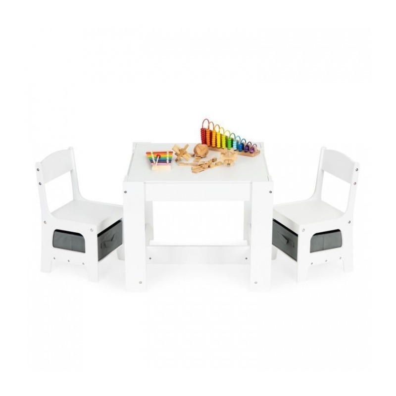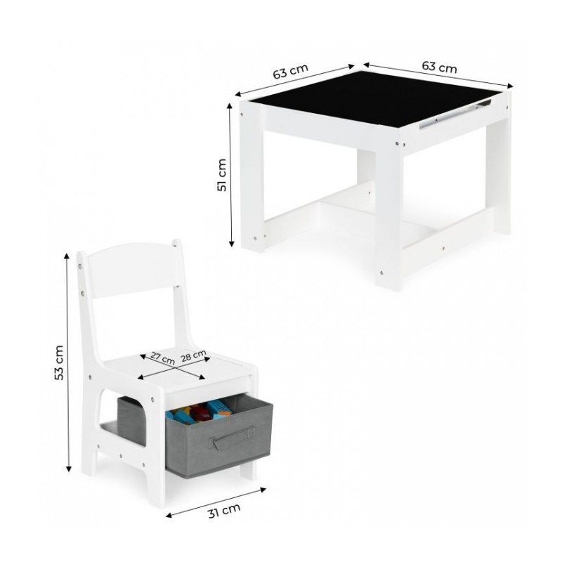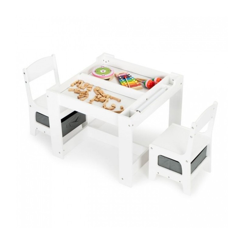 Setul are o structura din lemn, durabila si stabila, partea superioara detasabila cu doua fete va permite sa o utilizati ca tabla. Sub partea superioara (capac) exista compartimente functionale pentru depozitarea blocurilor, jucariilor sau a altor obiecte mici. Tot sub blatul mesei se afla si o rola de hartie pe care copilul poate desena sau picta.
