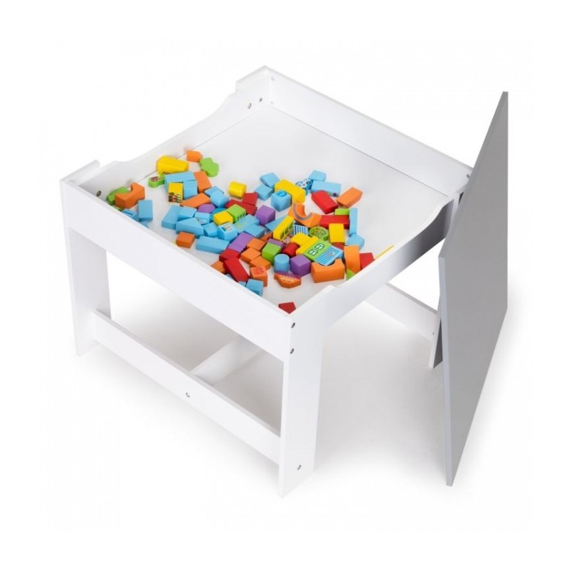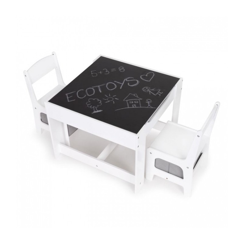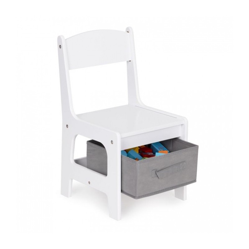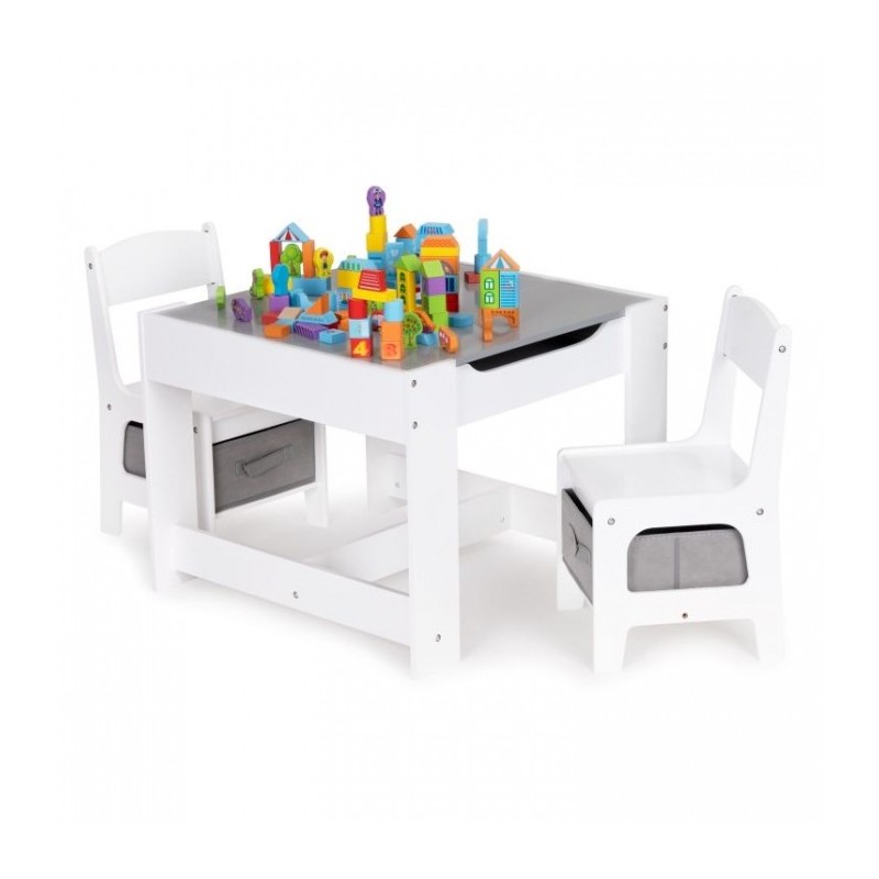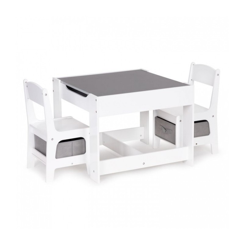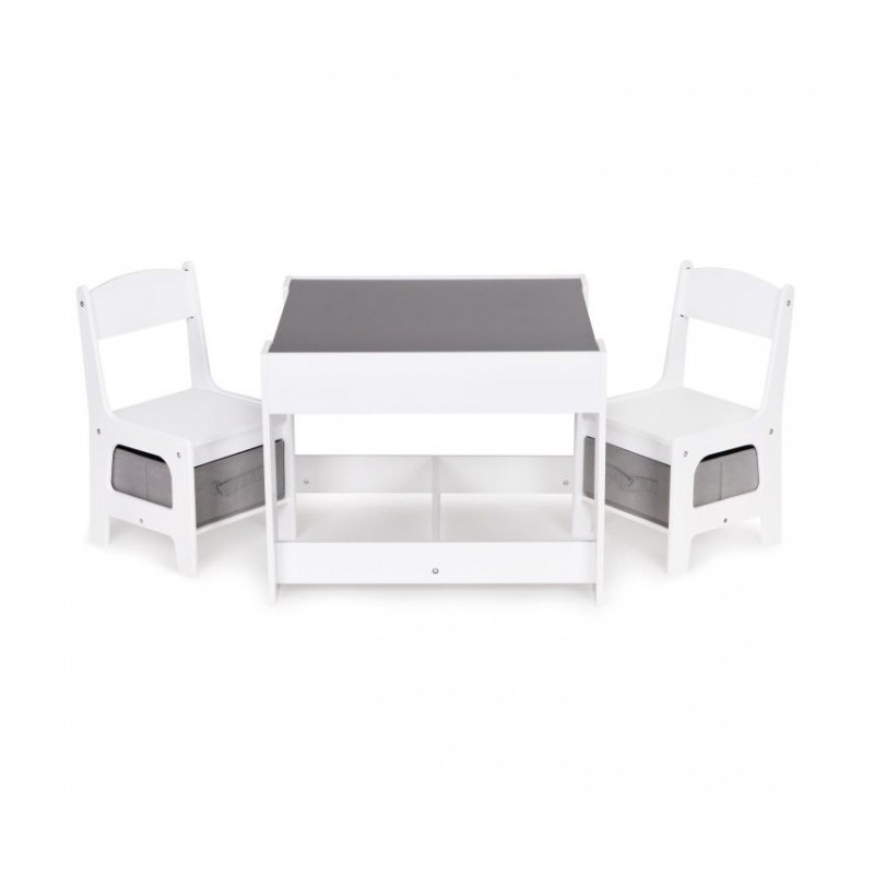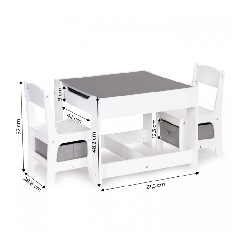 Un set de mobilier pentru copii realizat din placa MDF vopsita si picioare de lemn frumos finisate. Masa are un blat mare, rezistent, iar sub scaune se gasesc cosuri de depozitare textile. Mobilierul este rezistent la zgarieturi si utilizare de catre copii. Toate marginile sunt finisate usor si sunt sigure pentru copii.