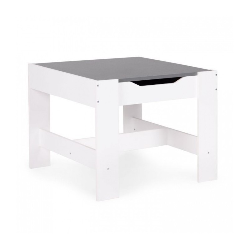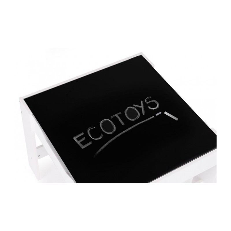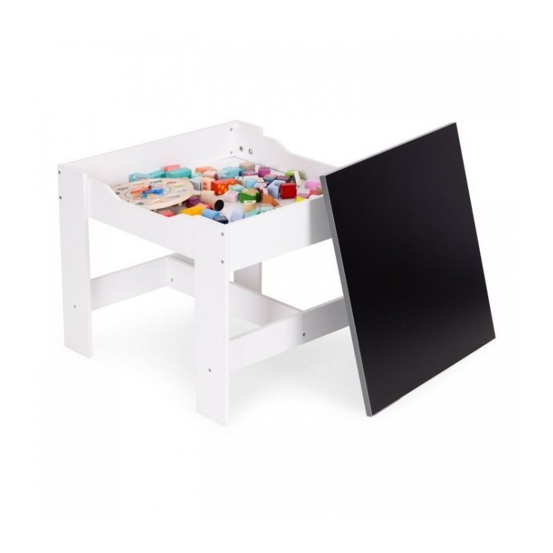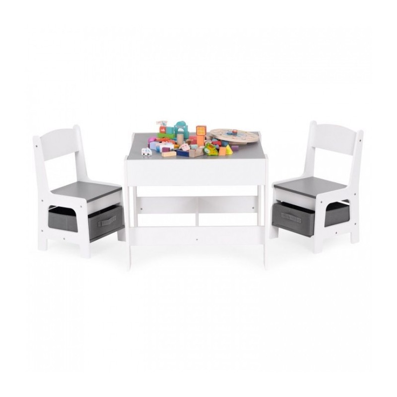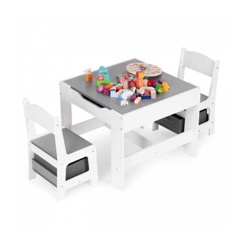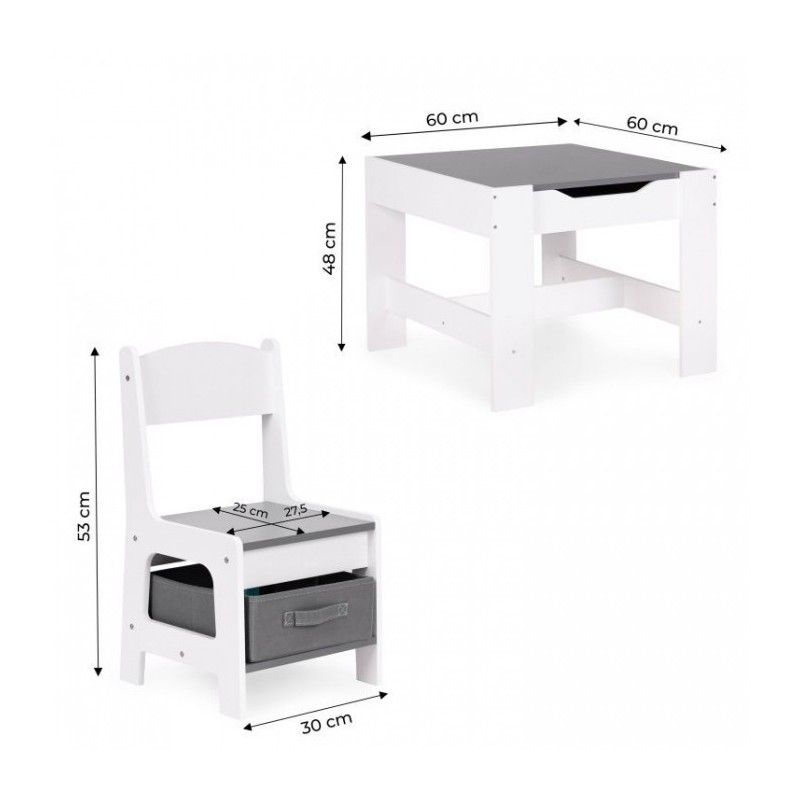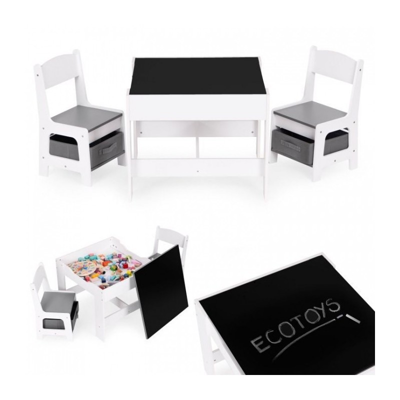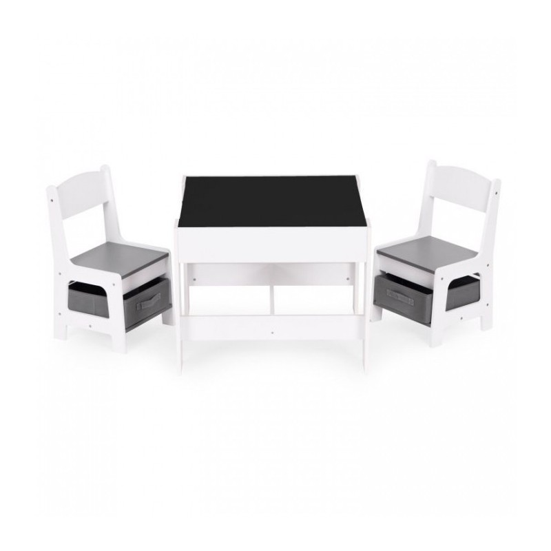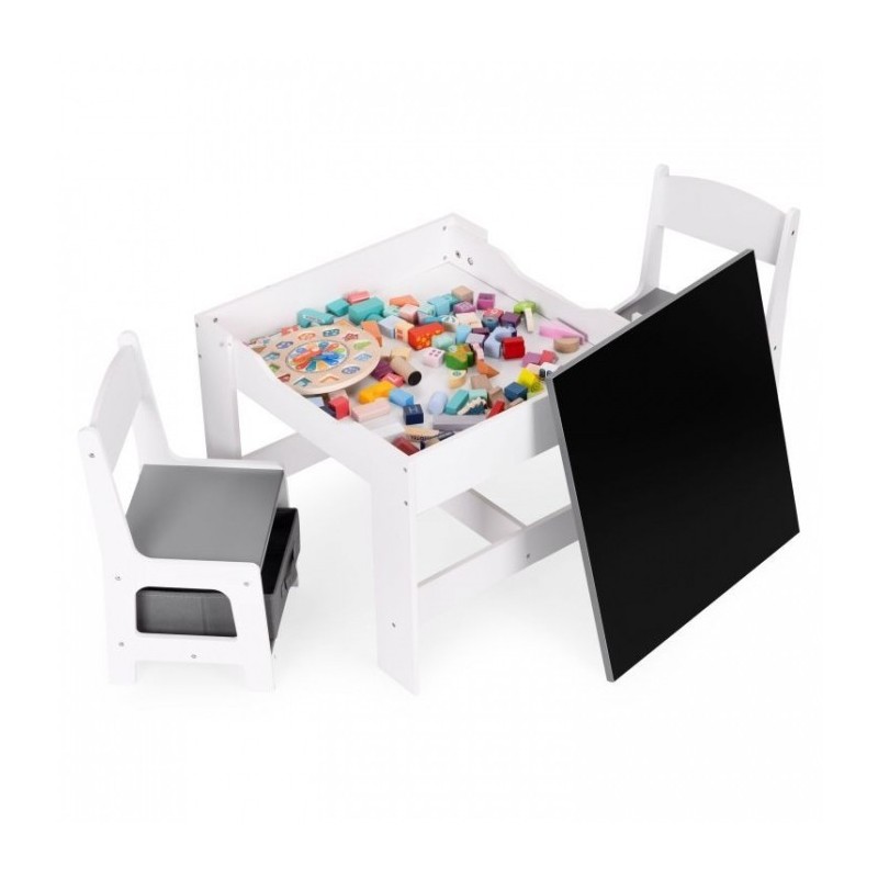Setul include 2 scaune si o masa. Setul are o structura realizata din MDF durabila si stabila. Masa este echipata cu un blat detasabil dublu, cu tabla cu creta pe o parte.