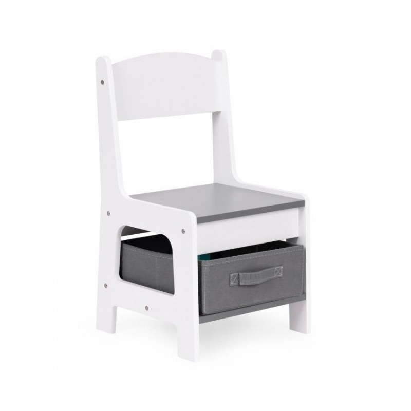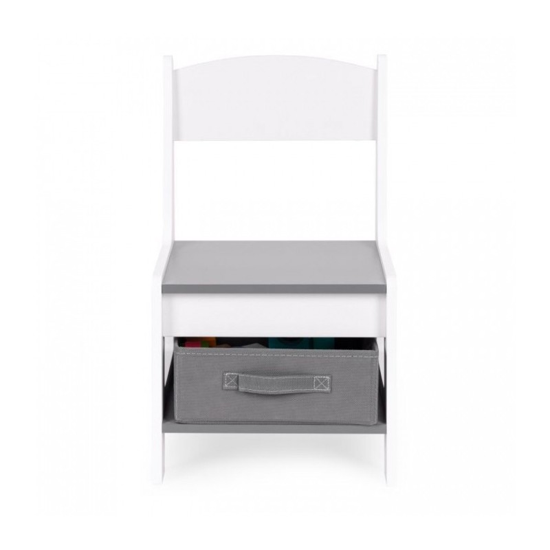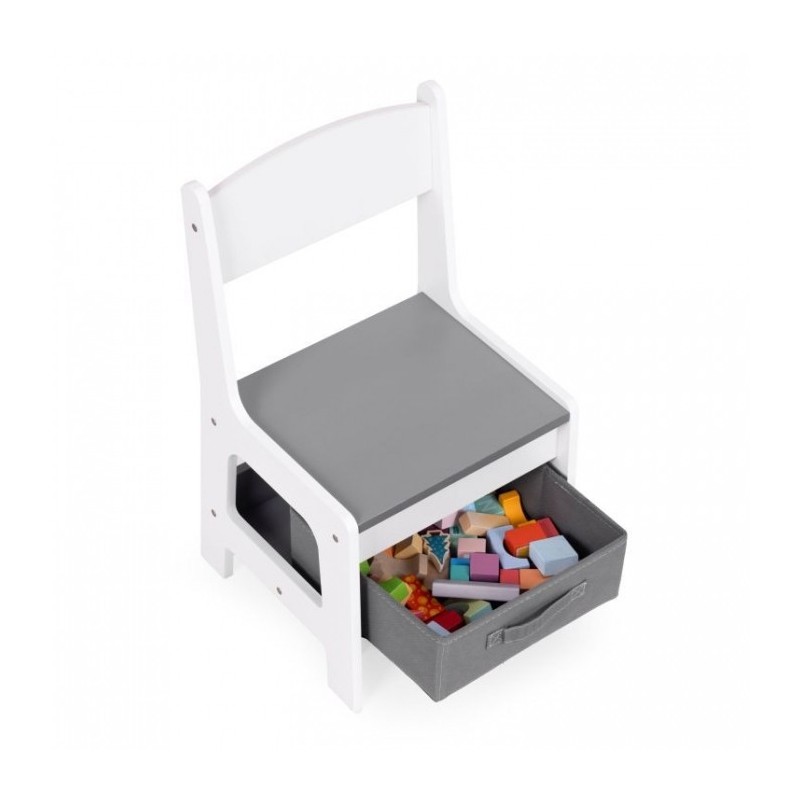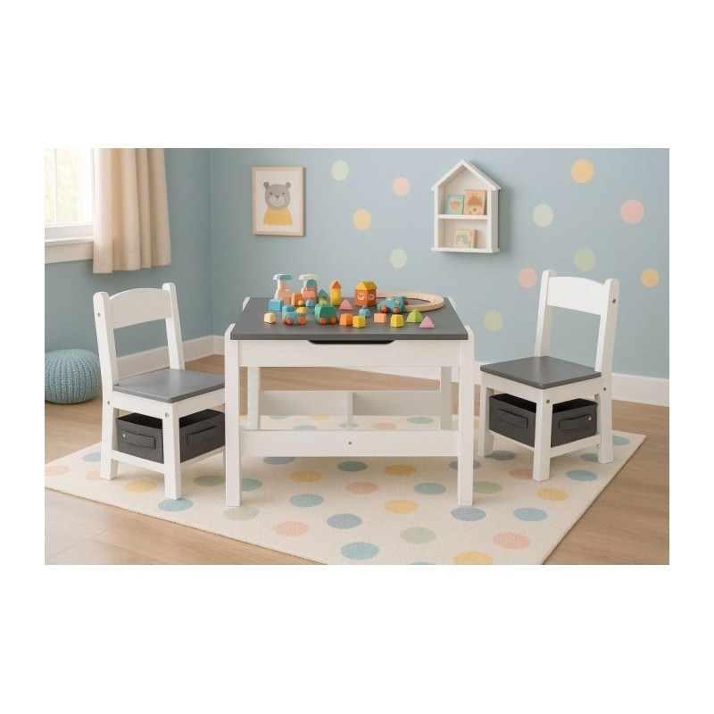 Sub blat exista un spatiu functional pentru depozitarea diverselor obiecte. Sub sezutul scaunelor exista sertare textile spatioase, perfecte pentru depozitarea jucariilor.