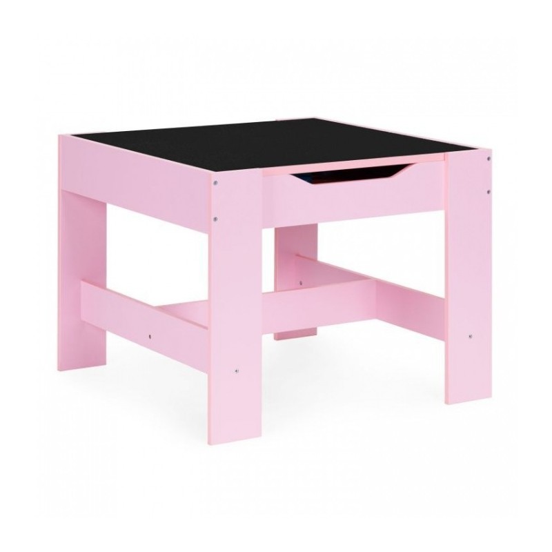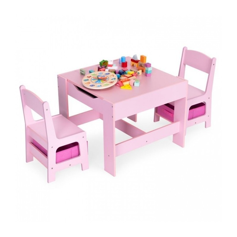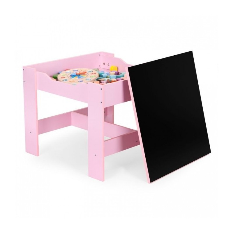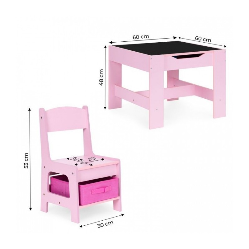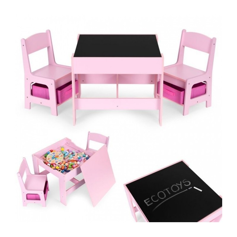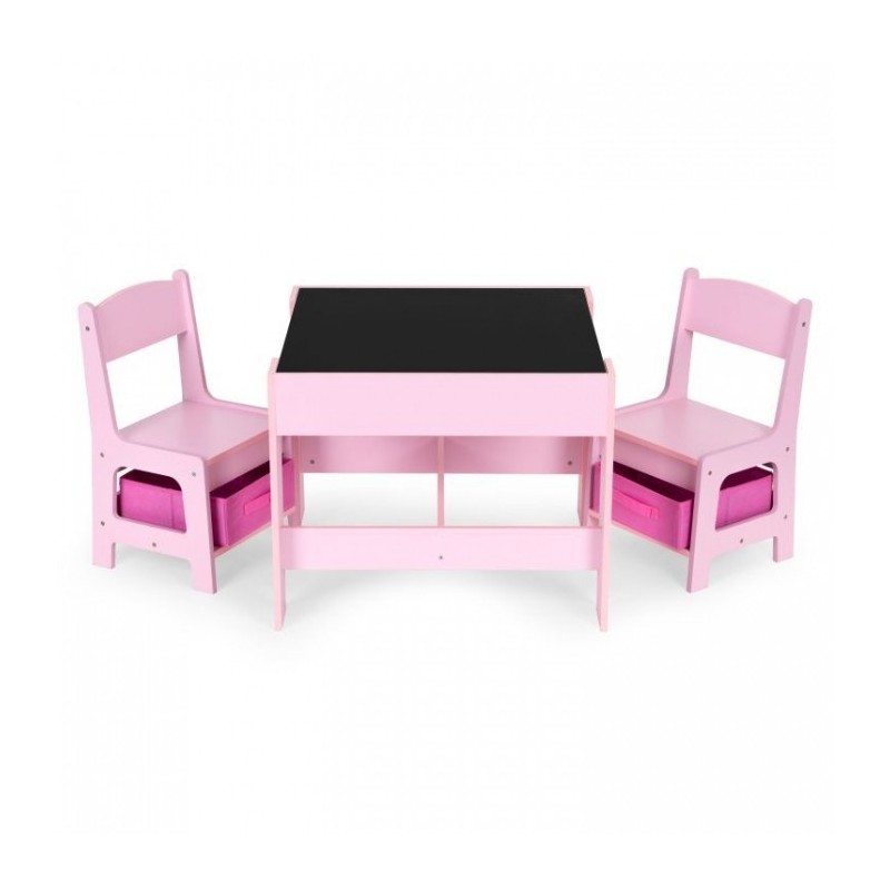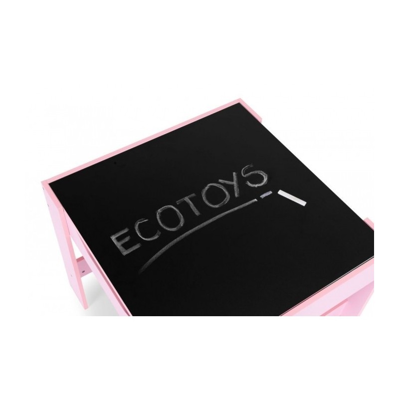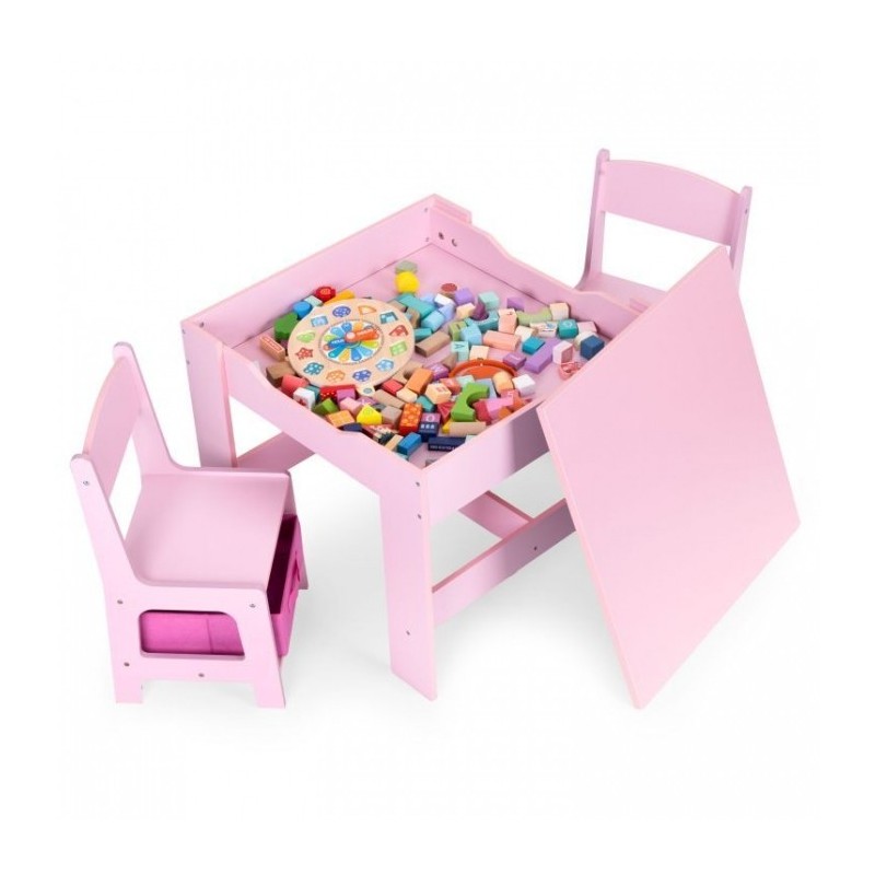 Setul include 2 scaune si o masa. Setul are o structura realizata din MDF durabila si stabila. Masa este echipata cu un blat detasabil dublu, cu tabla cu creta pe o parte.