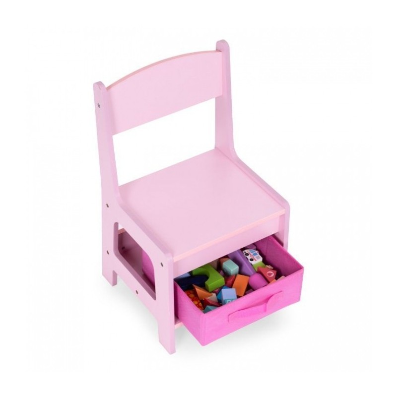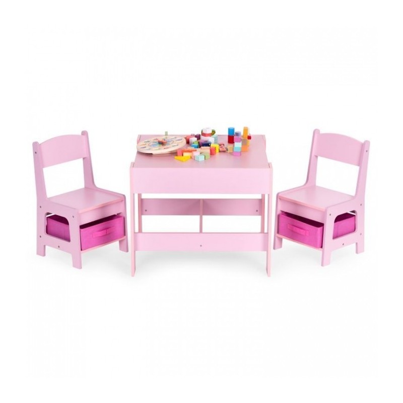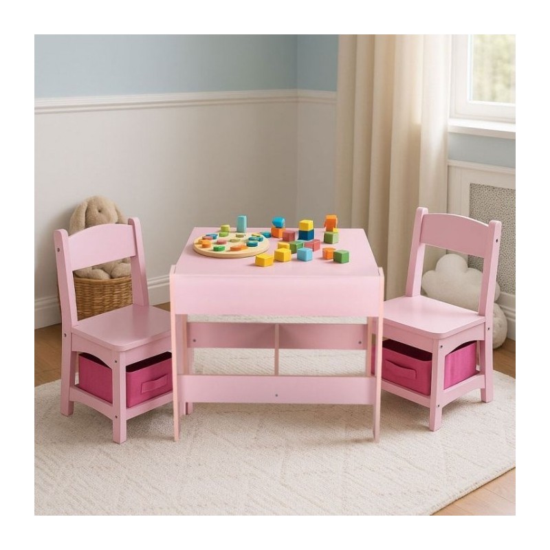 Sub blat exista un spatiu functional pentru depozitarea diverselor obiecte. Sub sezutul scaunelor exista sertare textile spatioase, perfecte pentru depozitarea jucariilor.