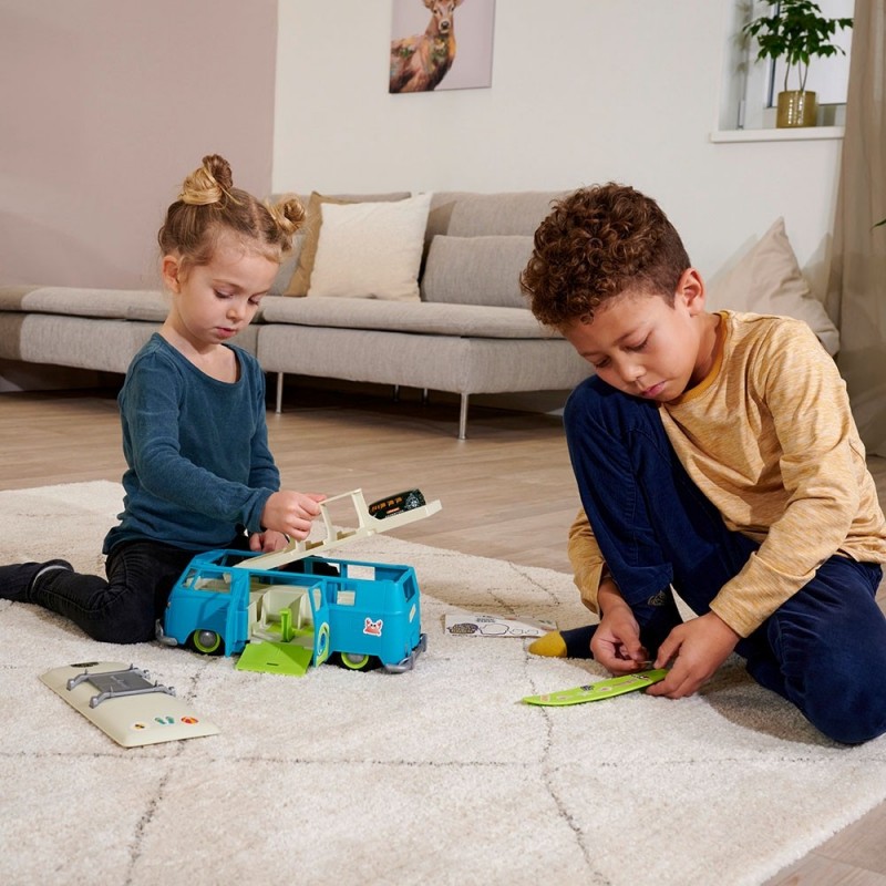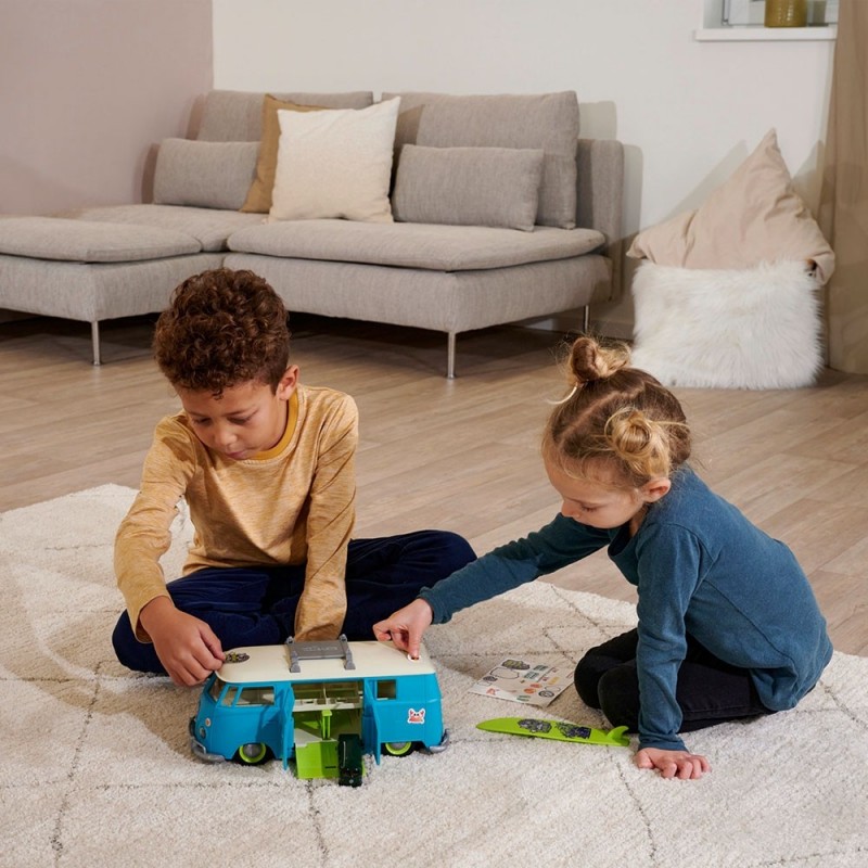 Bucurati-va de o zi la malul marii cu legendarul autobuz Volkswagen T1! Pe langa un design albastru stralucitor atragator, autobuzul Volkswagen dispune de o placa de surf detasabila, montata pe acoperis, pentru a te duce la plaja