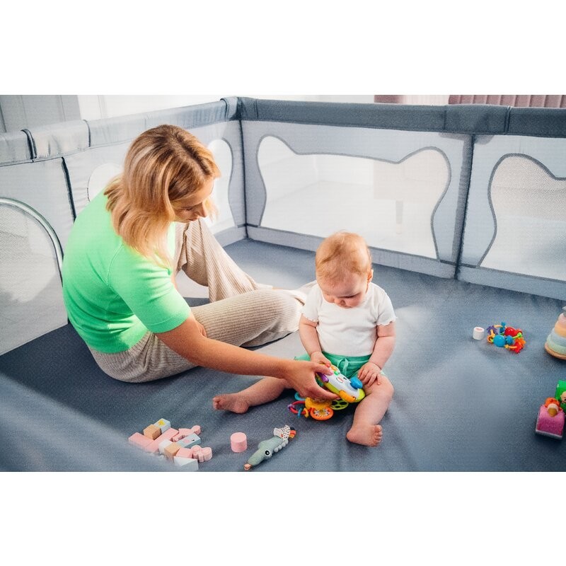 Laturile inalte ale tarcului de joaca sunt realizate din plasa, care nu numai ca asigura circulatia aerului, dar garanteaza si o buna vizibilitate, astfel incat parintele sa poata controla ce se intampla cu cel mic. Partile moi minimizeaza riscul unui posibil impact, iar designul asemanator urechilor de urs incurajeaza copiii sa se joace singuri in interiorul tarcului.
