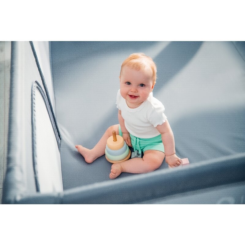 Datorita spatiului de joaca separat, parintele poate indeplini alte sarcini in timp ce copilul se afla intr-un loc sigur. Cele doua intrari laterale cu fermoar permit controlul deplin al spatiului - fermoarul este la exterior, astfel incat numai parintele poate decide sa le deschida. Produsul poate fi desfacut si pliat fara utilizarea uneltelor, iar dimensiunea compacta si geanta inclusa faciliteaza depozitarea. Materialul tarcului de joaca este usor de curatat, astfel incat produsul va dura multi ani.
