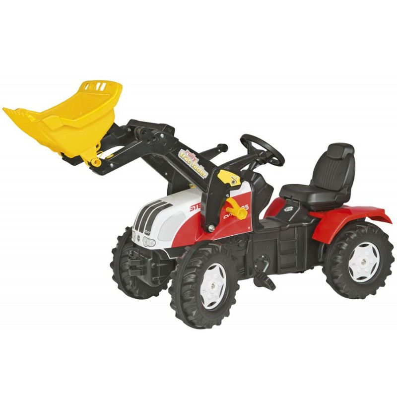 In fata tractorul are o cupa cu care copilul poate sa mute nisip.