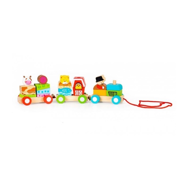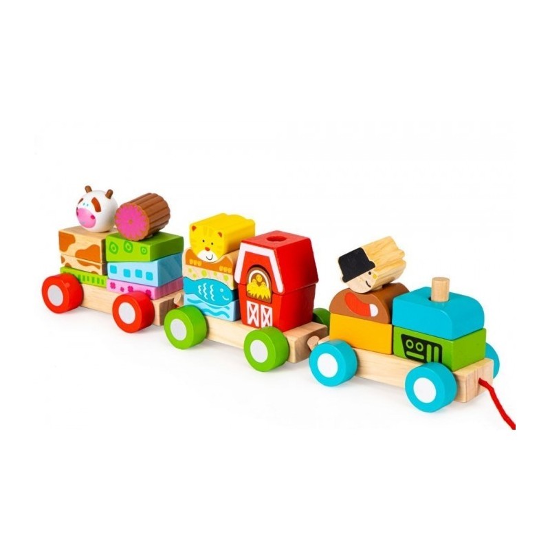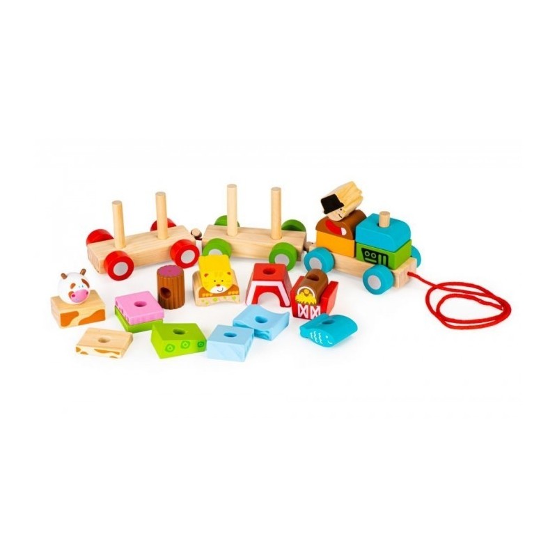 Blocuri din lemn sigure pentru copii care formeaza un tren cu vagoane.