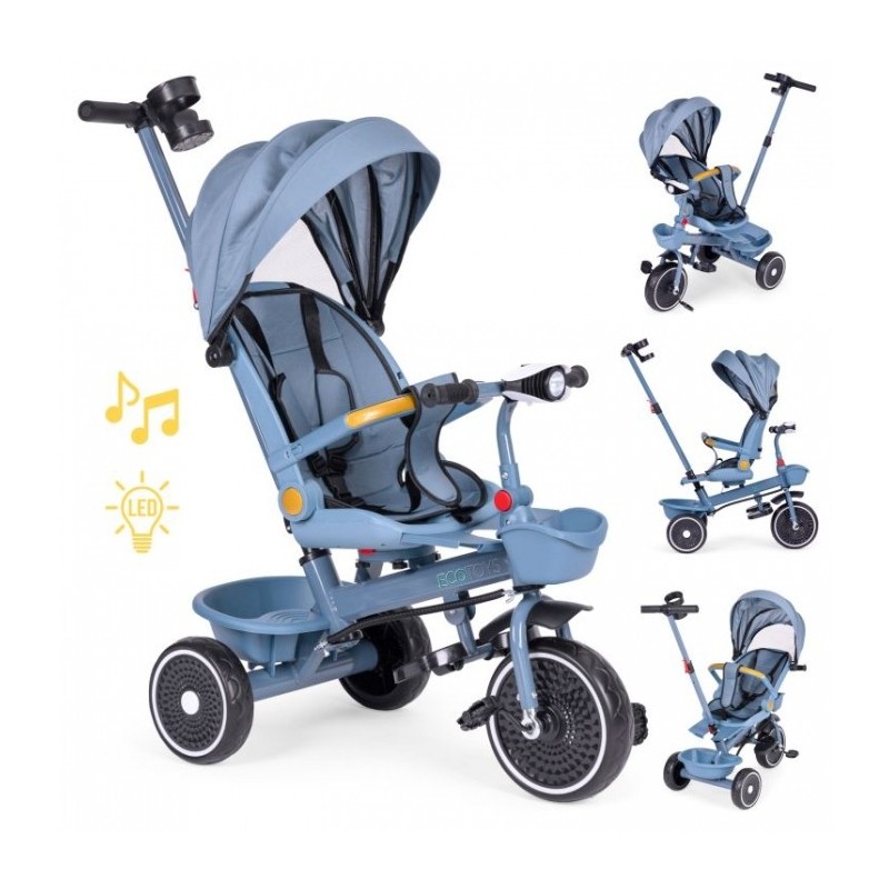 Rotile EVA durabile garanteaza o calatorie lina si silentioasa pe diferite suprafete. In plus, tricicleta este echipata cu un far care emite lumina colorata si diverse melodii, care cu siguranta vor aduce un plus tricicletei si bucurie copilului dvs.