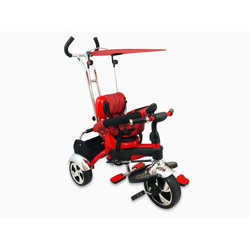 Tricicleta copii este prevazuta cu maner pentru dirijarea directiei, copertina ajustabila, cos pentru jucarii, 2 suporturi pentru picioare, husa pentru scaun cu centura de siguranta cu prindere in 5 puncte.