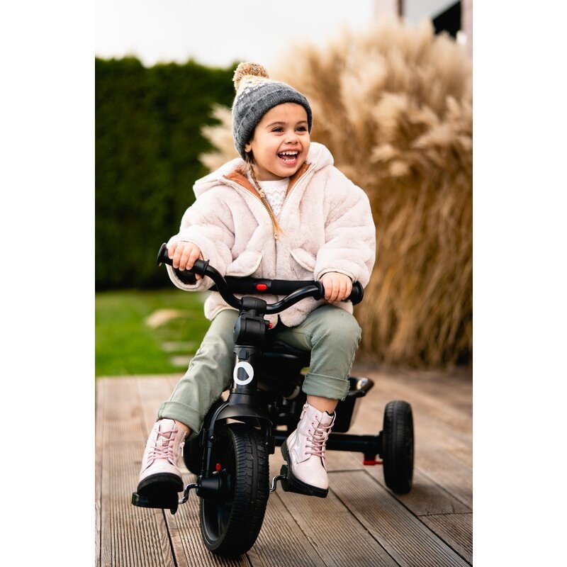 Tricicleta Haari 2 in 1 este echipata cu roti usoare cu banda de rulare, realizate din PU de inalta calitate. Capacul deasupra rotii din fata functioneaza ca un aparator de noroi si protejeaza picioarele copilului impotriva incurcarii. Produsul are un suport pentru picioare pentru copiii care inca nu pot ajunge la pedale. Utilizarea unei roti libere permite copilului sa pedaleze, dar parintele pastreaza controlul complet asupra directiei si vitezei de deplasare. Exista un ajutor suplimentar sub forma unui maner reglabil, a carui inaltime poate fi adaptata la inaltimea proprie.