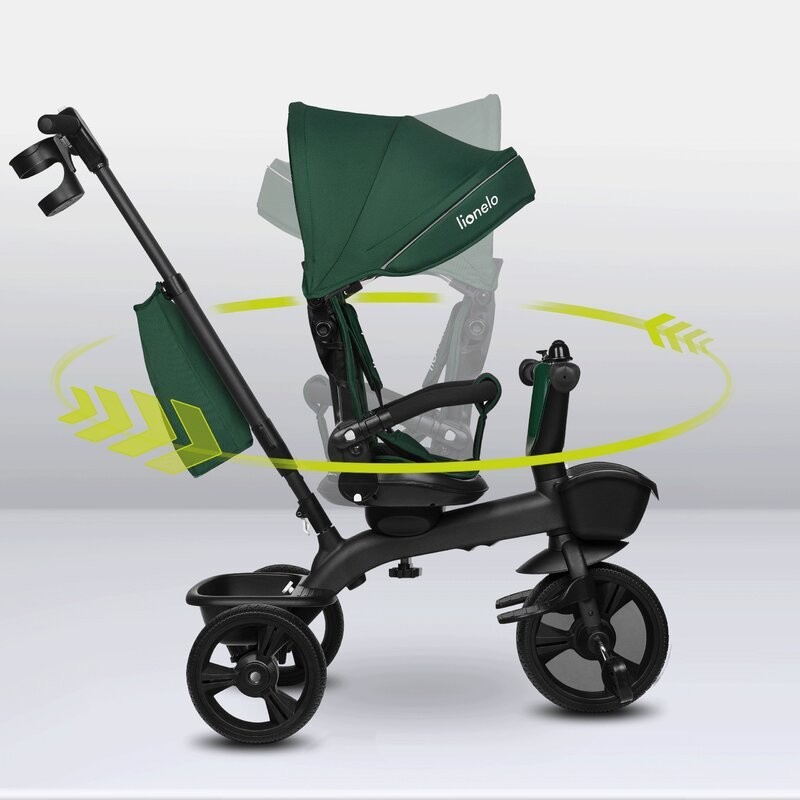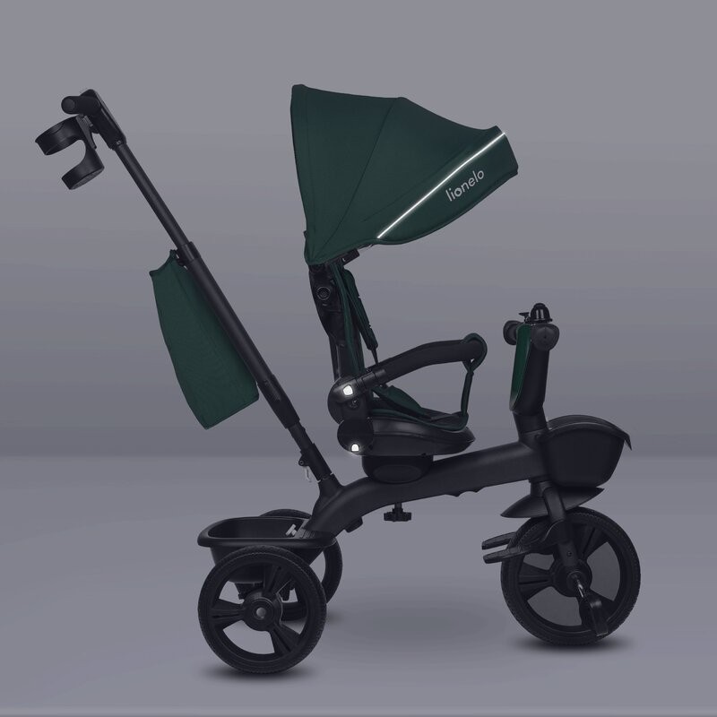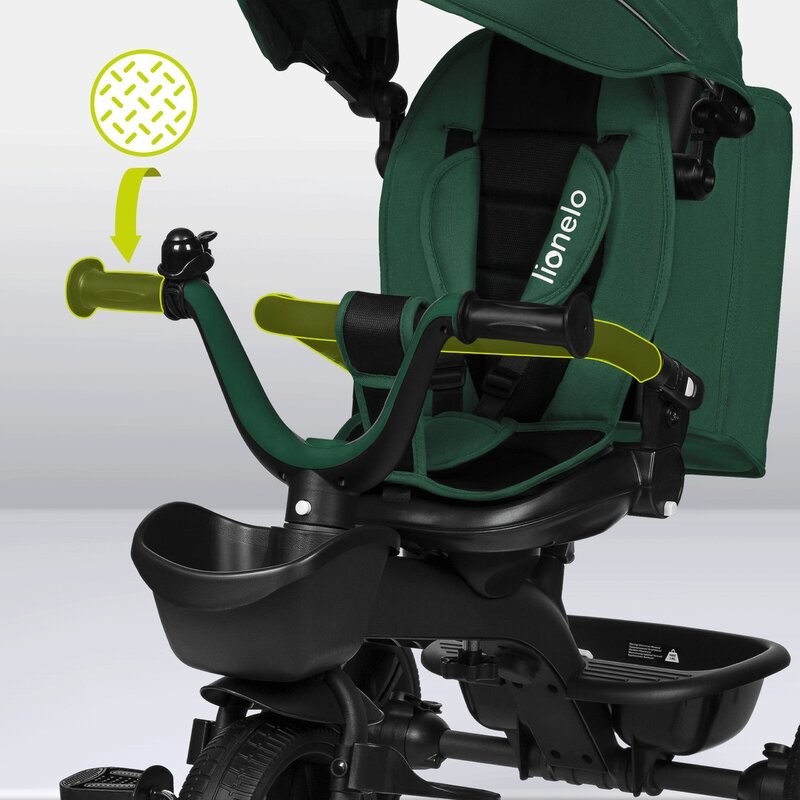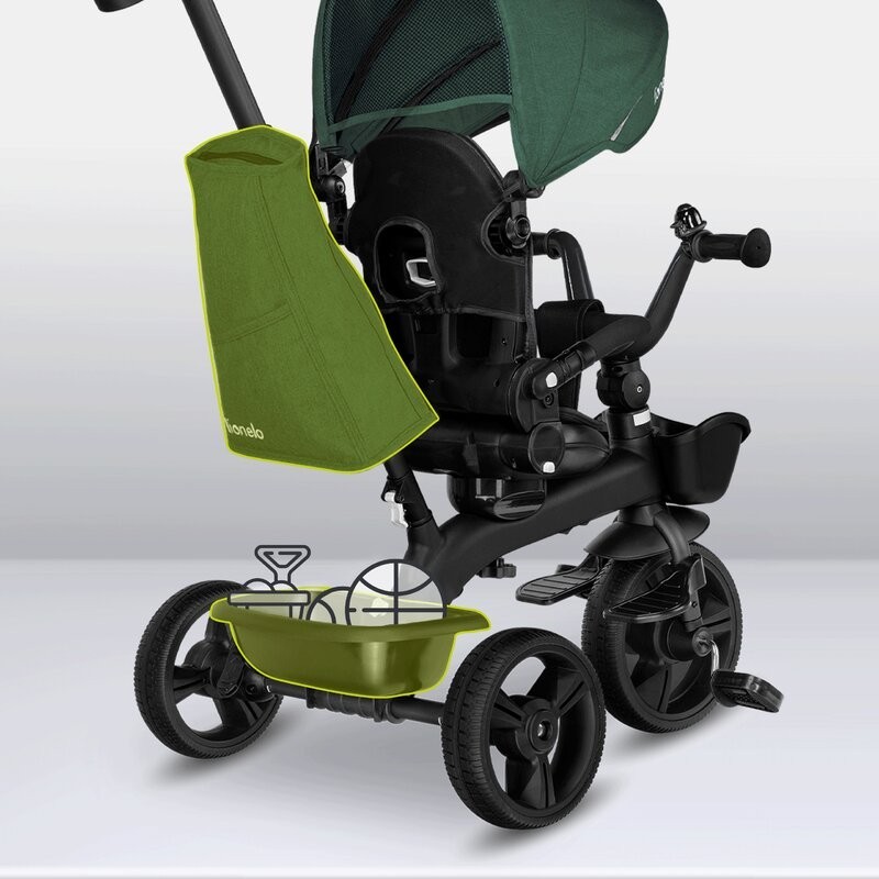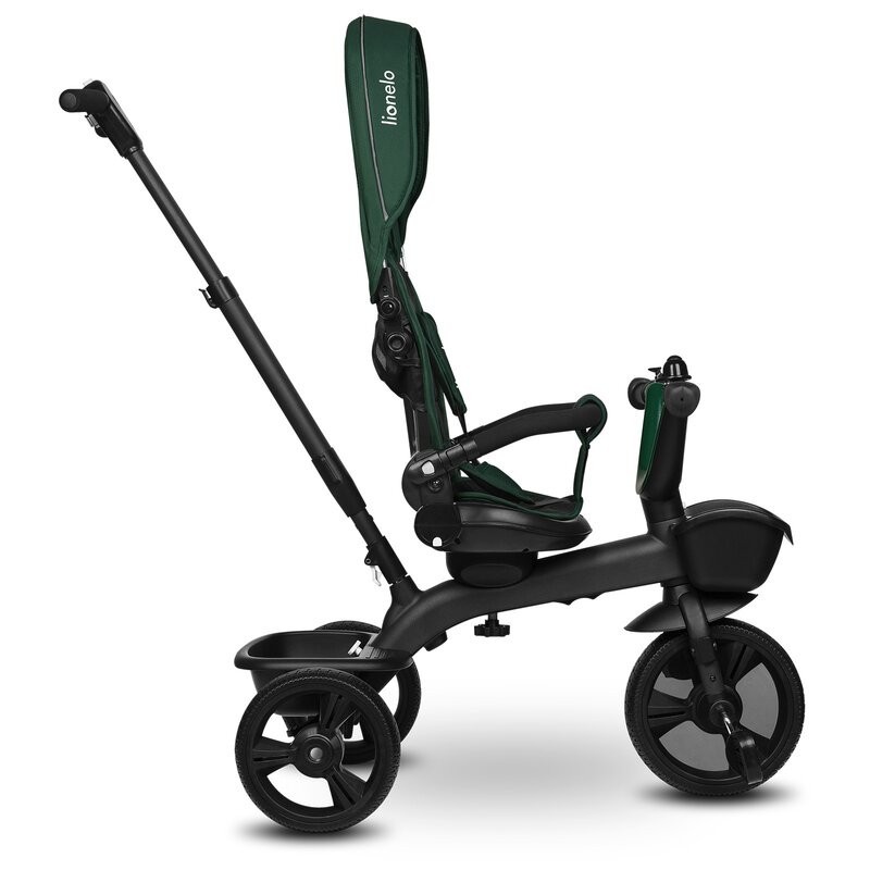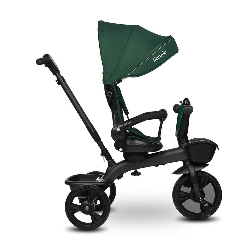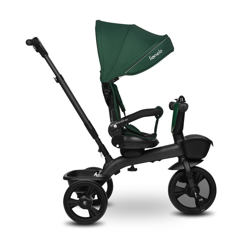 Lionelo Kori este o combinatie intre un carucior si o tricicleta clasica. Deoarece pozitia scaunului poate fi schimbata cu 180_, copilul poate calatori atat cu fata, cat si cu spatele spre directia de mers. Produsul poate fi condus cu un maner reglabil, dar copilul are permisiunea de a pedala in acelasi timp. Cand micul utilizator este suficient de inalt, puteti detasa manerul, suportul pentru picioare si arcul, astfel incat sa devina un calaret.