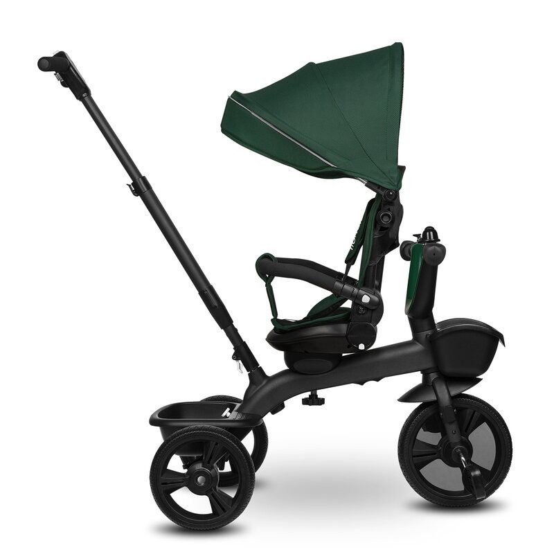 Vehiculul vine cu o copertina detasabila in 3 niveluri cu o plasa usoara integrata si o reglare a spatarului in 3 niveluri. Setul include, de asemenea, doua cosuri pentru articole indispensabile, precum si o geanta practica cu fermoar. In plus, manerul folosit pentru controlul produsului poate fi completat cu un suport pentru cana sau sticla.