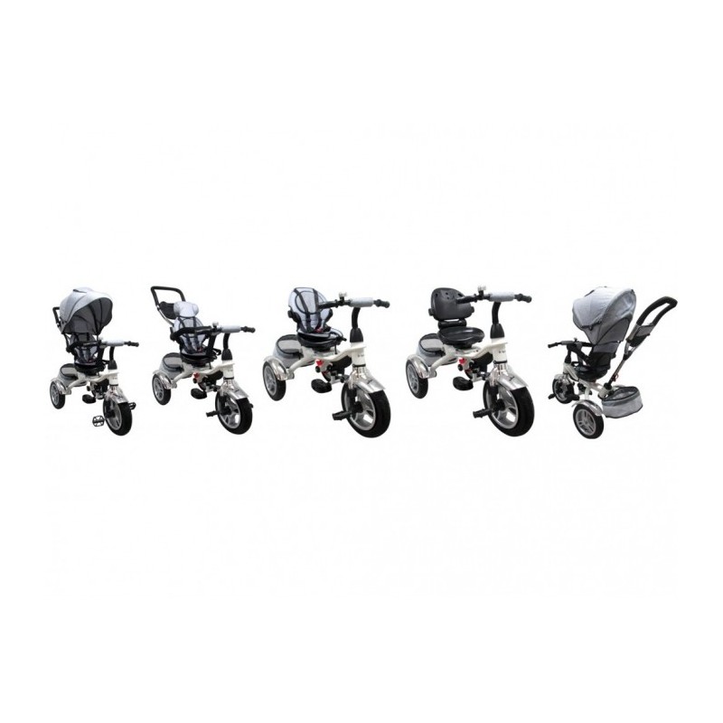 1. Tricicleta cu echipament complet: parasolarul protejeaza copilul impotriva razelor UV, centurile de siguranta protejeaza copilul, parintele controleaza manerul din spate (manerul directioneaza ghidonul astfel incat tricicleta sa fie controlara de catre acesta), manerul poate fi reglat cu aproximativ 4 cm.
