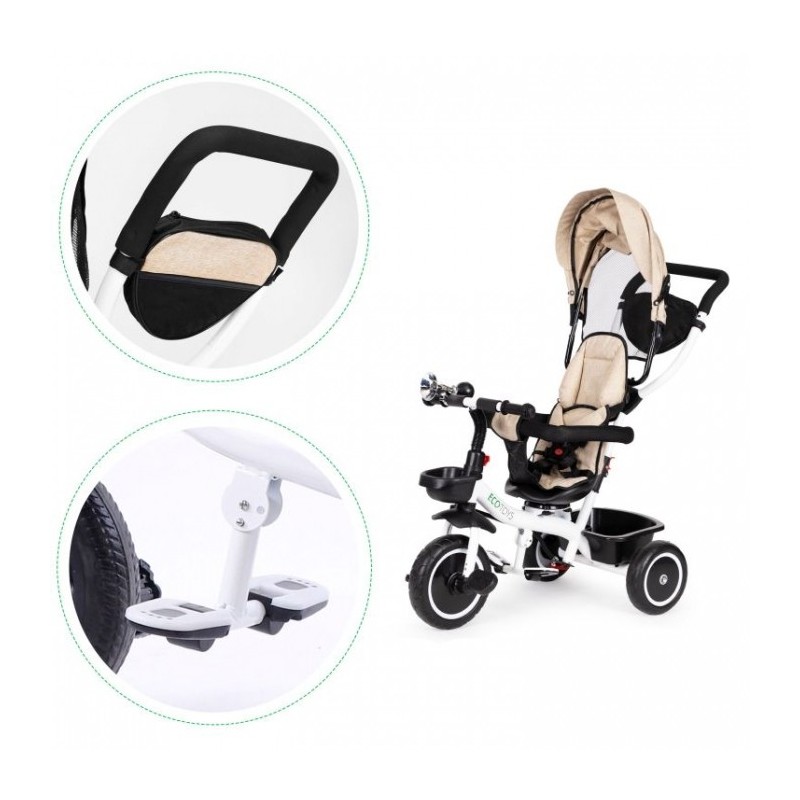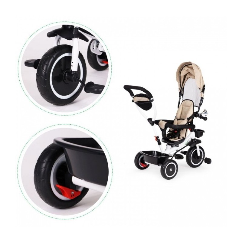 Tricicleta este prevazuta cu roti din spuma EVA (nu este cauciuc gonflabil) iar ambele roti din spate au un sistem de siguranta activat de catre utilizatorul adult, tricicleta devenind stationara