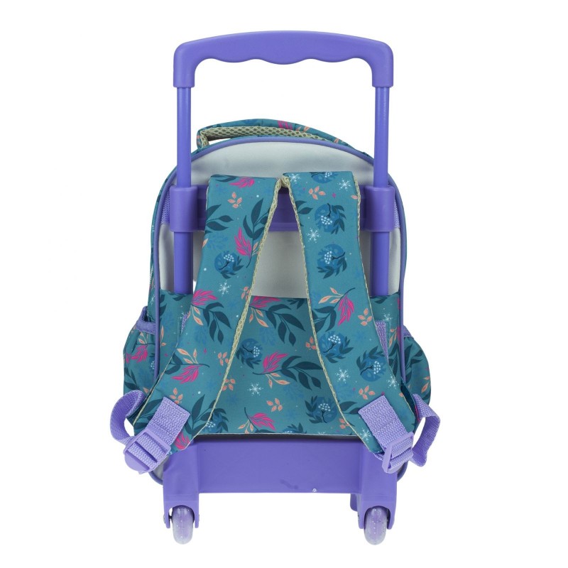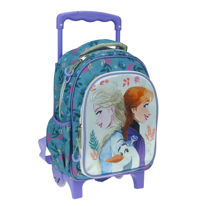 Ghiozdan Troller Disney Frozen Anna si Elsa pentru gradinita, confectionat din poliester, cu 2 compartimente cu fermoar, buzunare laterale pentru sticla, maner, bretele ergonomice reglabile si bara extensibila.