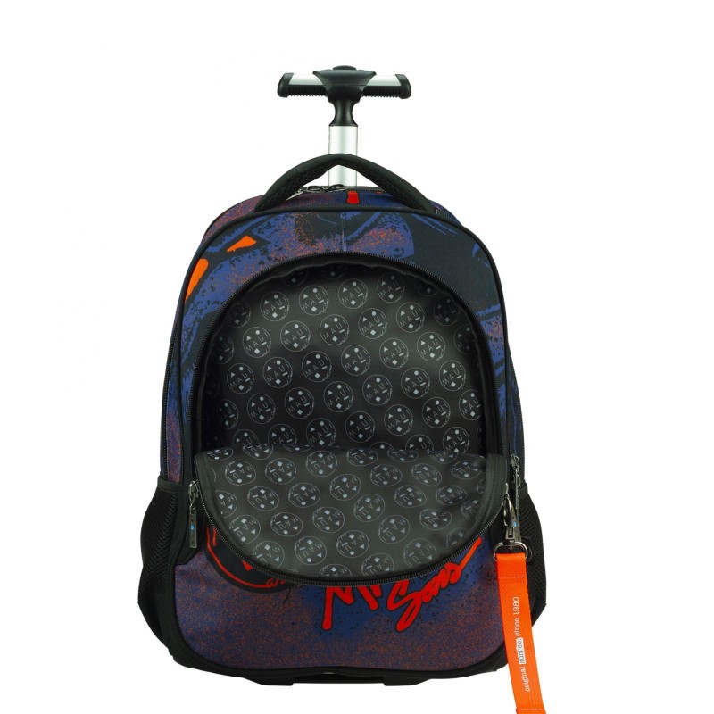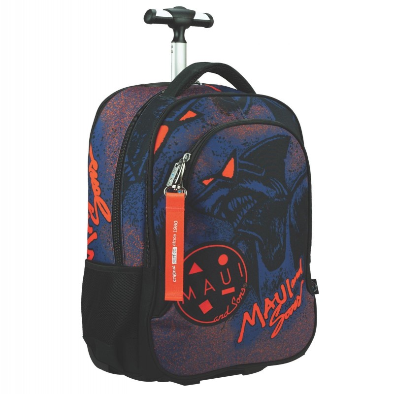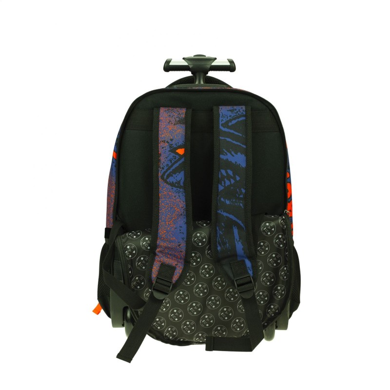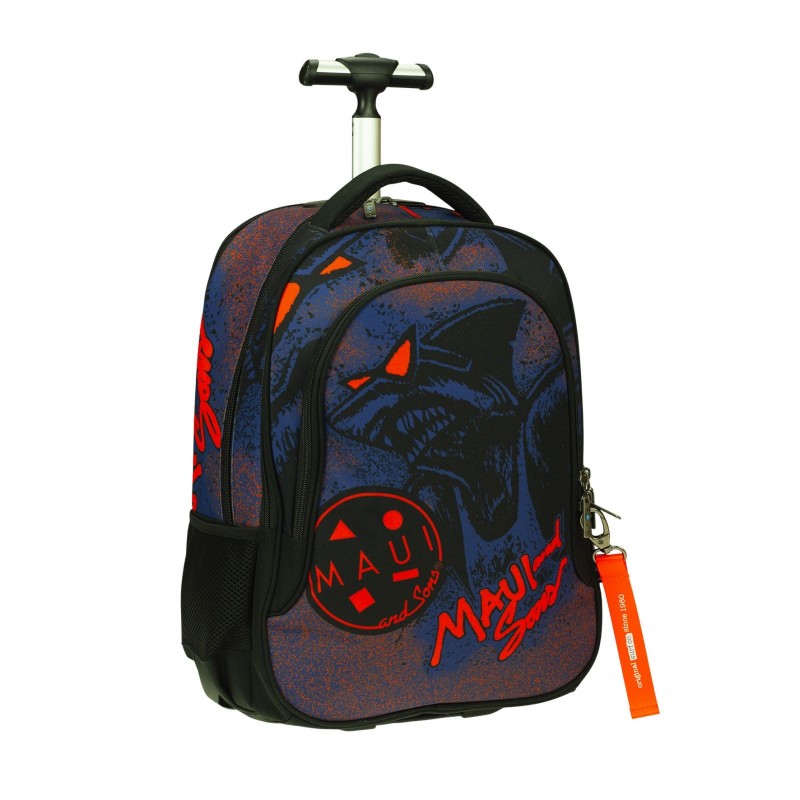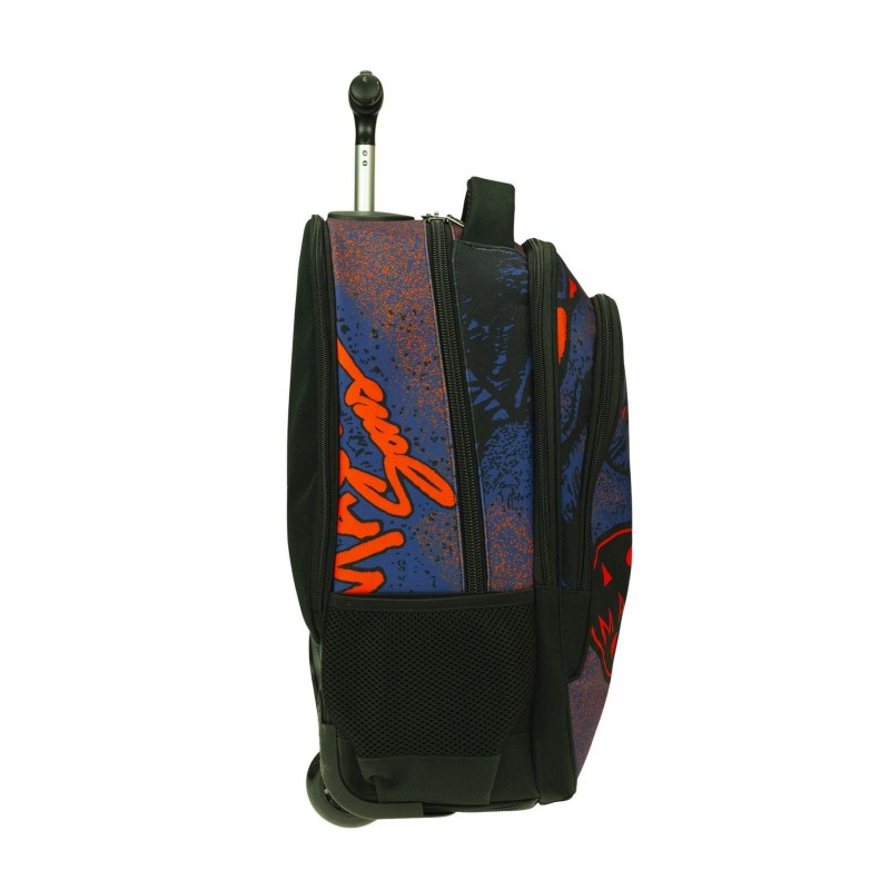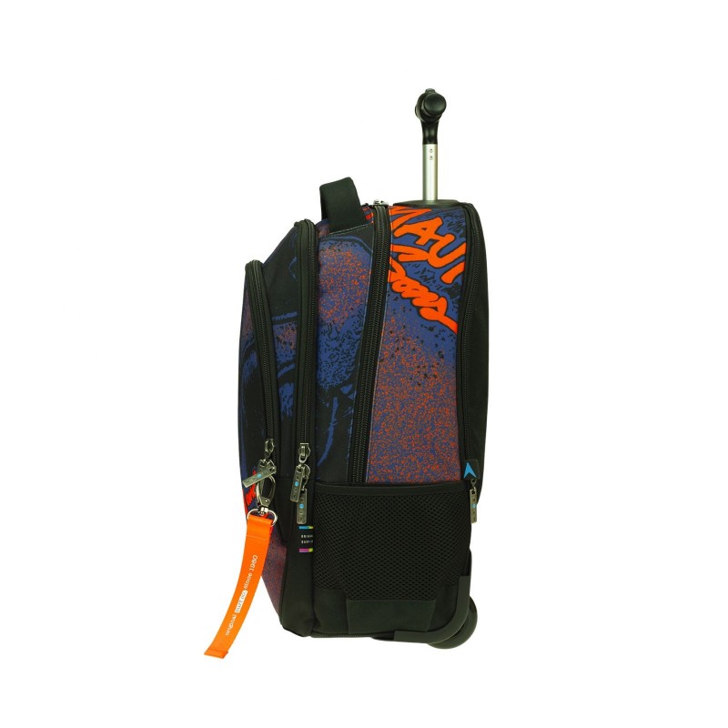 Troller scoala sau calatorie, confectionat din poliester, cu 3 compartimente cu fermoar, buzunare laterale pentru sticla, maner, bretele ergonomice reglabile si bara extensibila din aluminiu.