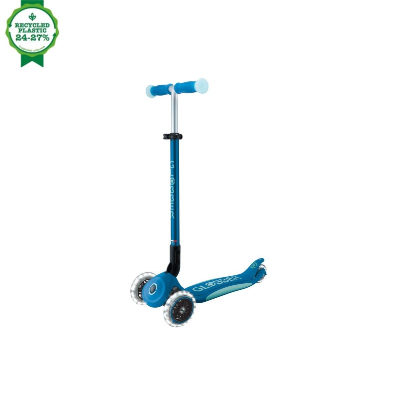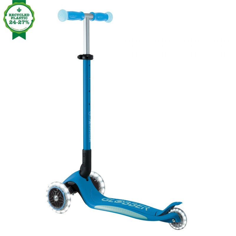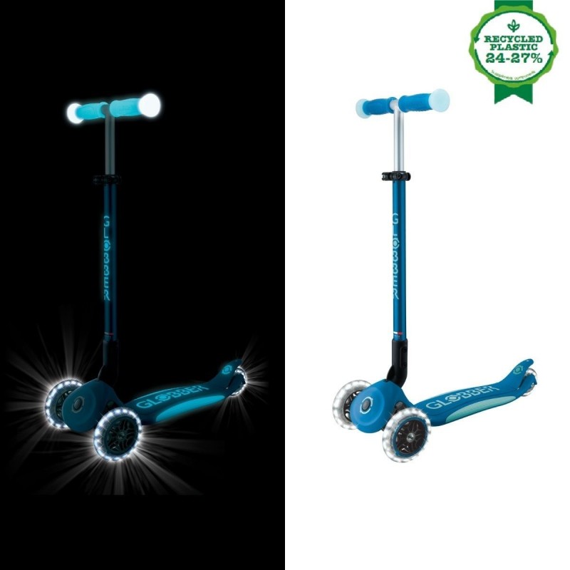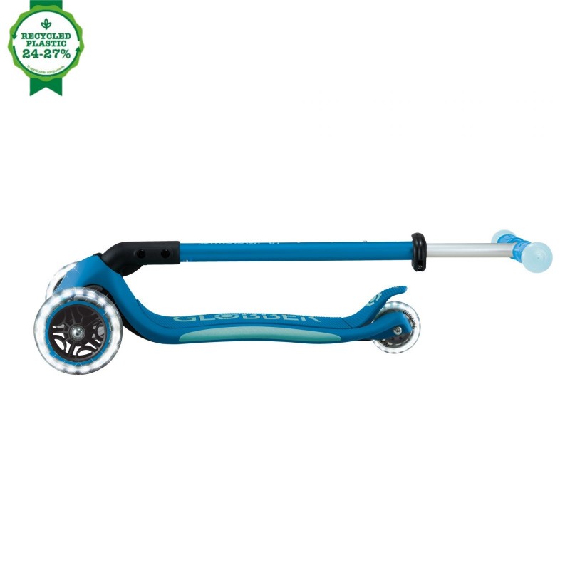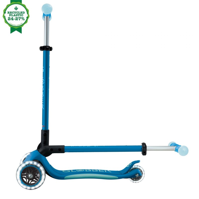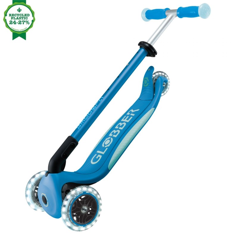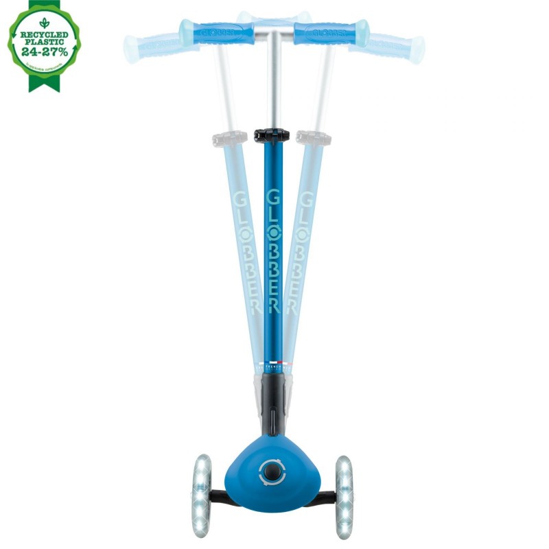 Sistem de pliere exclusiv patentat de GLOBBER - o simpla apasare de buton este suficienta pentru plierea ghidonului. Fabricată din 2528% plastic reciclat certificat GRS, ELITE GLOW LIGHTS îmbină sustenabilitatea modernă cu plăcerea maximă de a te da cu trotineta.