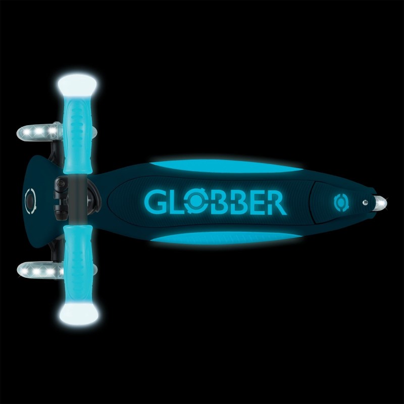 Ghidonul, platforma și frâna spate se aprind în întuneric, creând un efect „glow-in-the-dark” care face trotineta ușor de observat și extrem de atractivă pentru copii. În plus, LED-urile fără baterii se aprind automat atunci când trotineta este în mișcare. Astfel, copilul are parte de un spectacol de lumini la fiecare plimbare, crescând vizibilitatea și distracția, mai ales seara.