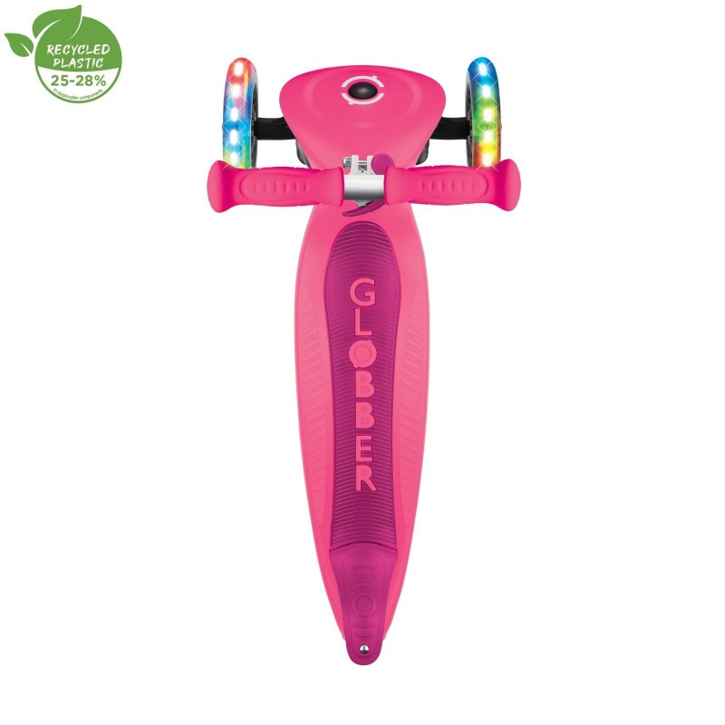 Este realizată în proporție de 25 - 28% din plastic certificat conform Global Recycled Standard (GRS)*. Astfel, contribui activ la o mobilitate prietenoasă cu mediul. Din 2022, GLOBBER a refolosit deja peste 118 tone de materiale reciclate, precum jucării vechi, plase de pescuit și ambalaje.