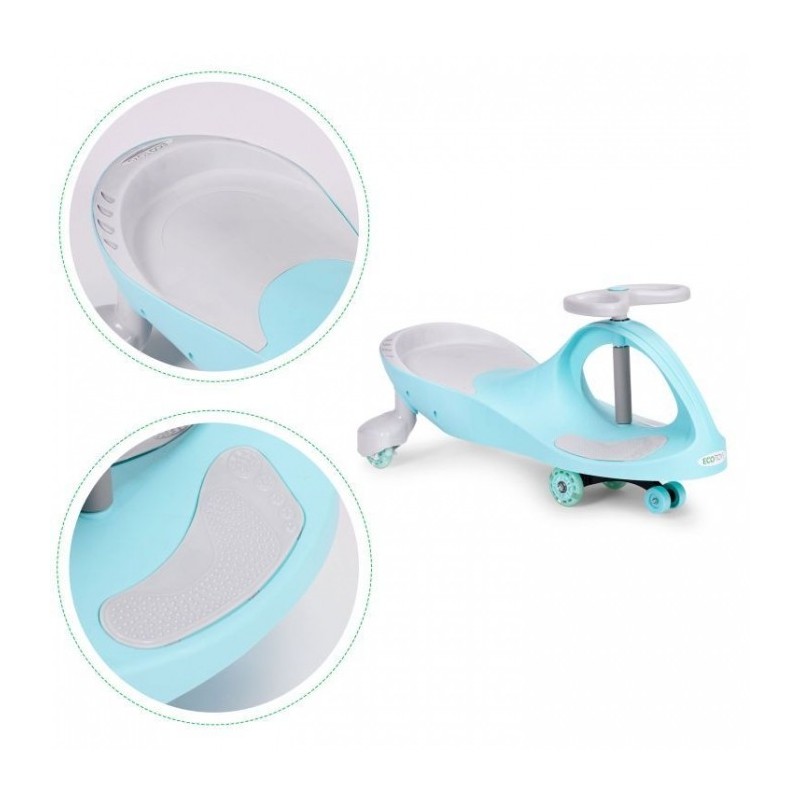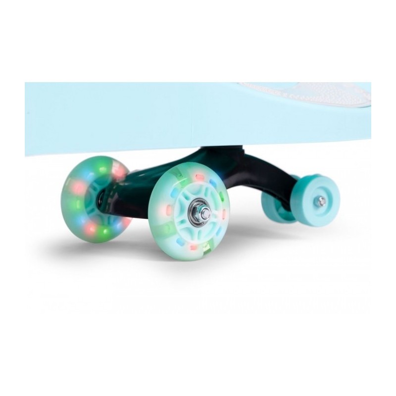 Rotile sunt realizate din cauciuc moale (poliuretan), astfel incat nu deterioreaza podeaua si garanteaza o calatorie placuta pe suprafetele mai putin plane. In timpul mersului, rotile stralucesc in culori diferite, oferind si mai multa distractie. Trotineta are un scaun ergonomic, suporturi antiderapante pentru picioare si un volan rotativ la 360°.