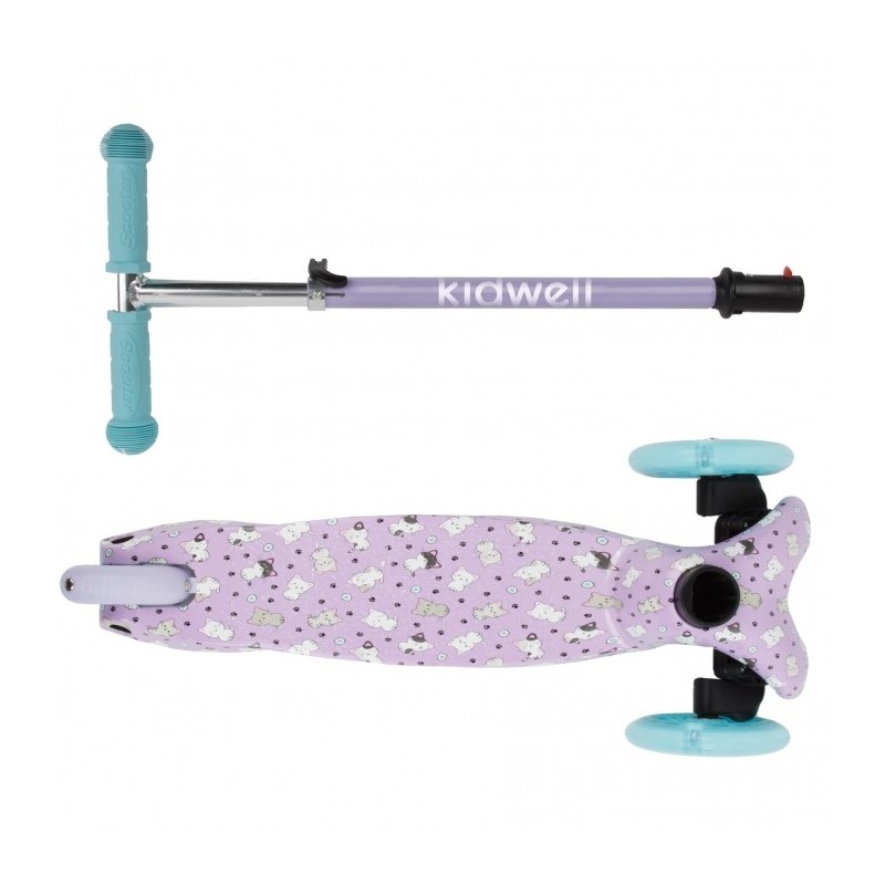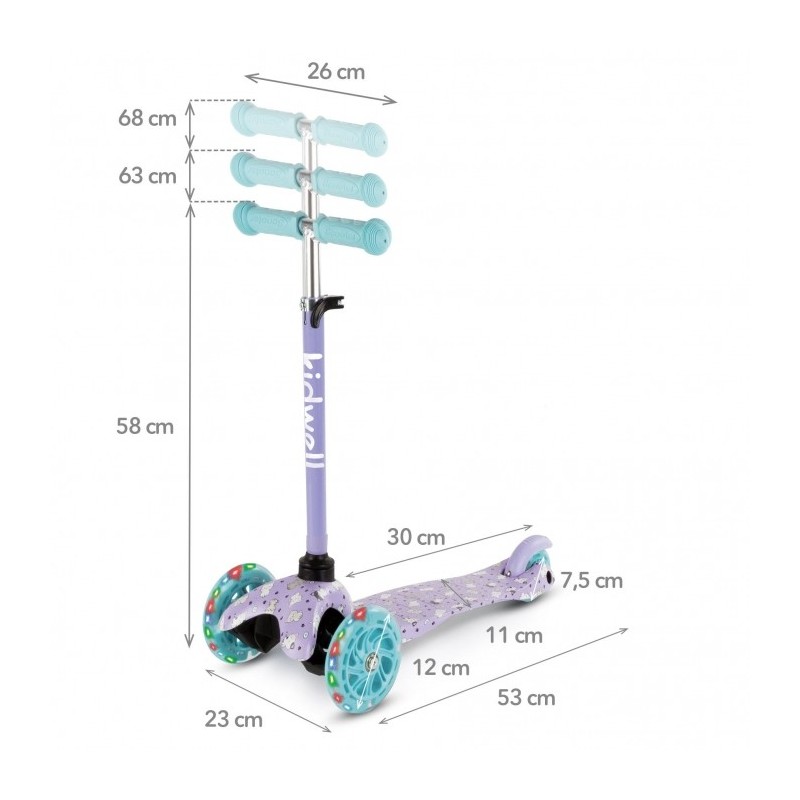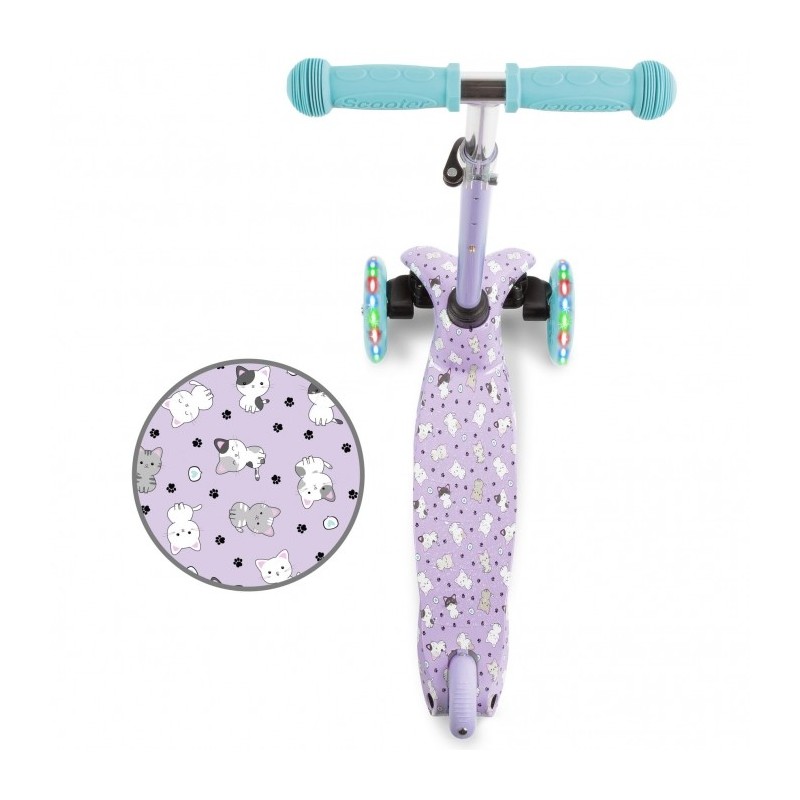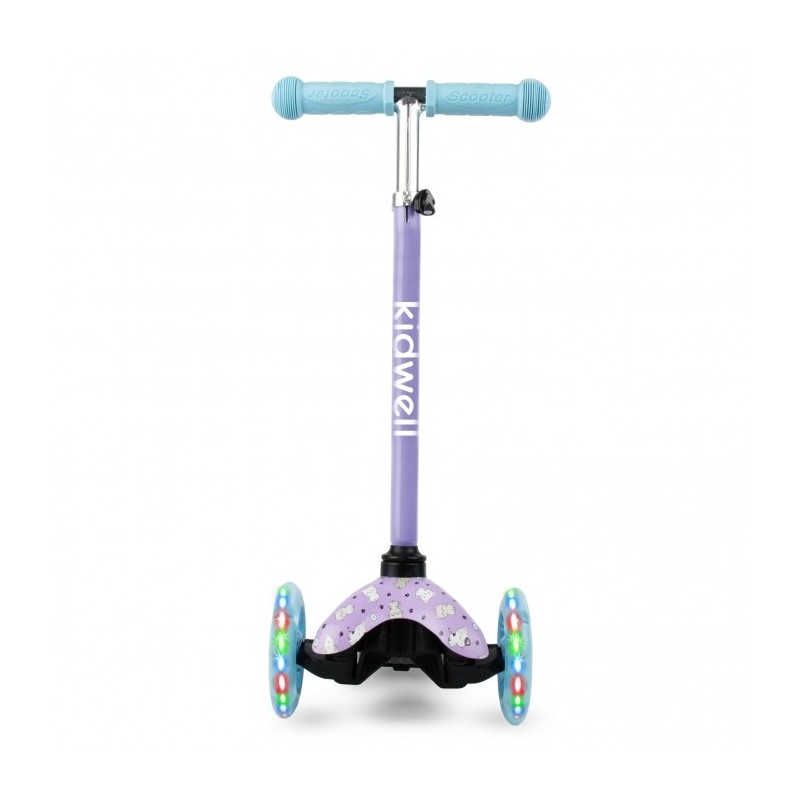 Structura durabila, usoara, cantarind 1.8 kg. Platforma larga de pe rotile din fata ajuta la mentinerea echilibrului. Rotile din poliuretan silentioase si durabile asigura o aderenta foarte buna la sol. Luminile cu LED incorporate in roti care stralucesc in timpul conducerii. Trotineta poate fi pliata scotand tija de directie. Ghidon din aluminiu cu reglare pe 3 cai a inaltimii. Unghiul limitat de directie minimizeaza schimbarea necontrolata de directie. Prezinta manere ergonomice la ghidon, platforma antiderapanta, frana pe puntea spate, rulmenti durabili.