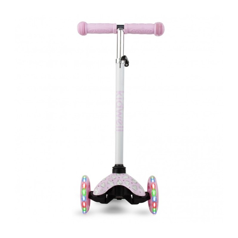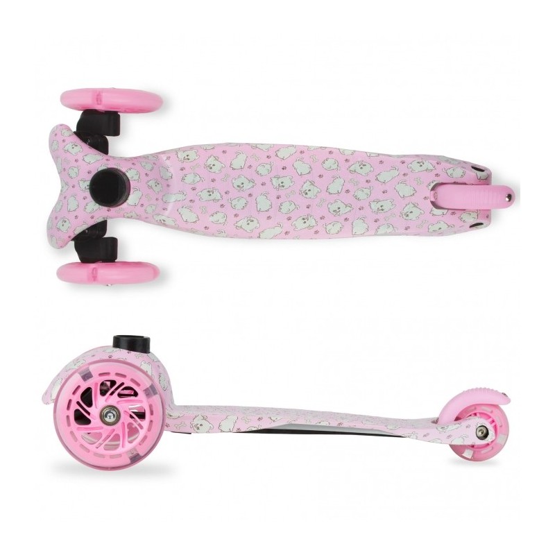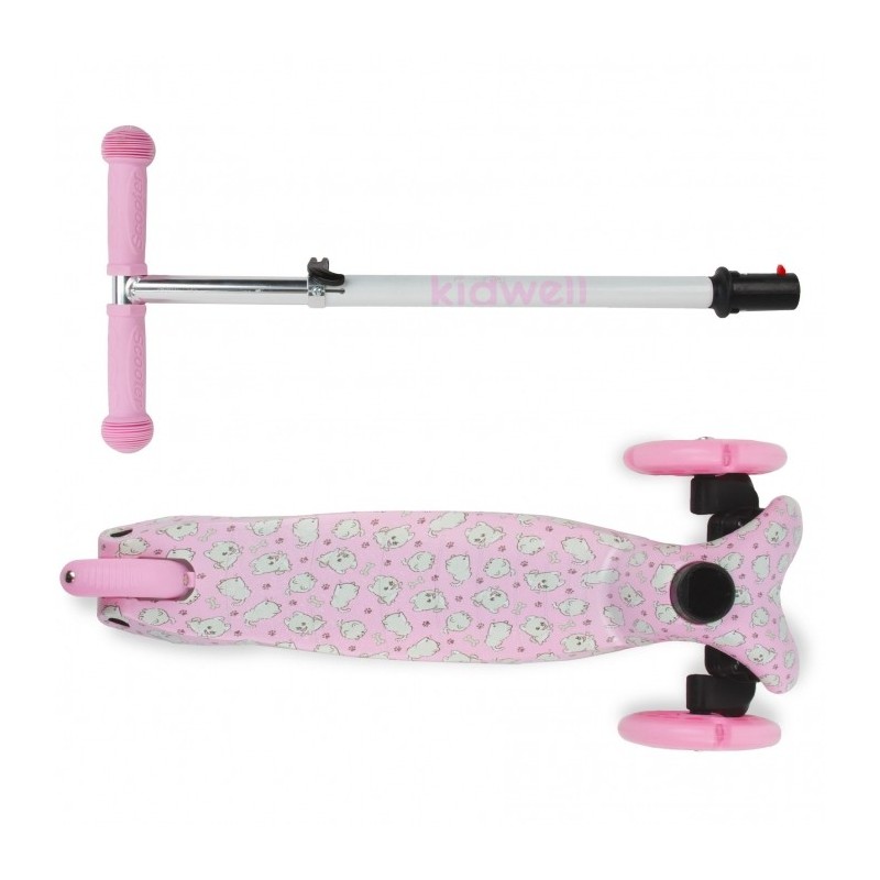 Structura durabila, usoara, cantarind 1.8 kg. Platforma larga de pe rotile din fata ajuta la mentinerea echilibrului. Rotile din poliuretan silentioase si durabile asigura o aderenta foarte buna la sol. Luminile cu LED incorporate in roti care stralucesc in timpul conducerii. Trotineta poate fi pliata scotand tija de directie. Ghidon din aluminiu cu reglare pe 3 cai a inaltimii. Unghiul limitat de directie minimizeaza schimbarea necontrolata de directie. Prezinta manere ergonomice la ghidon, platforma antiderapanta, frana pe puntea spate, rulmenti durabili.