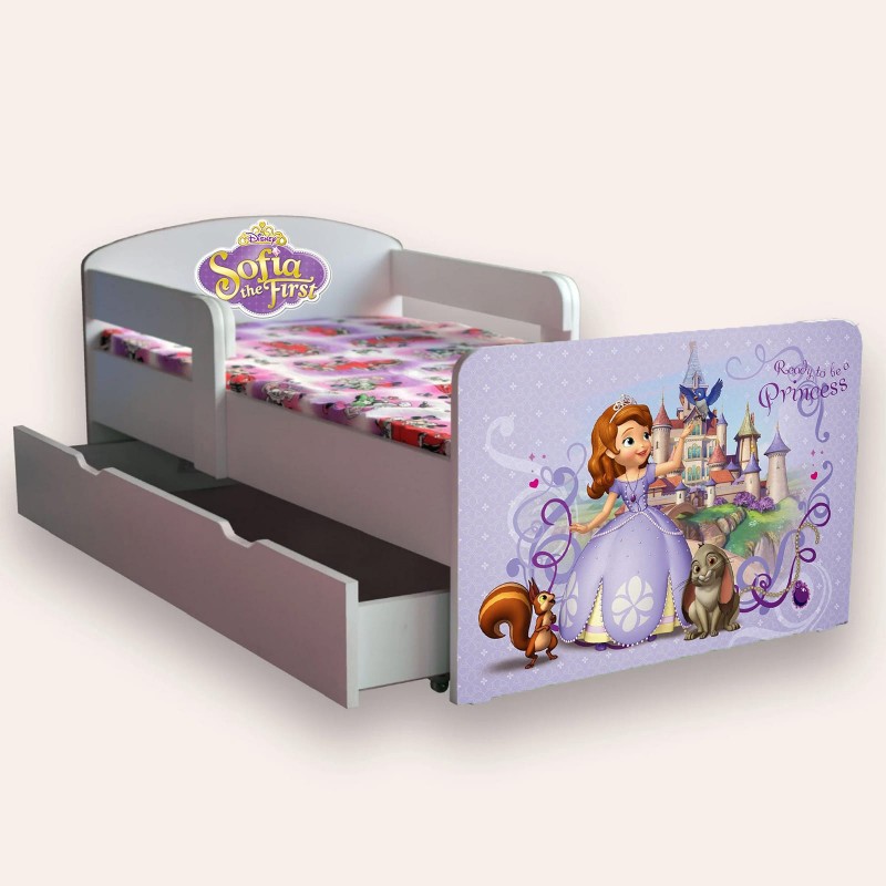 Materiale folosite pentru acest pat de copii: PAL melaminat de 18 mm, imagini imprimate laminate, bordura pvc de protectie, blat din pal de 18 mm.